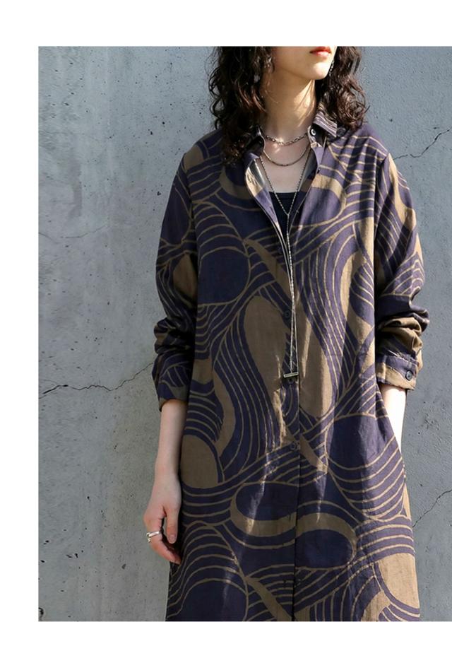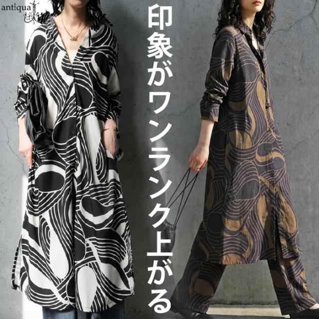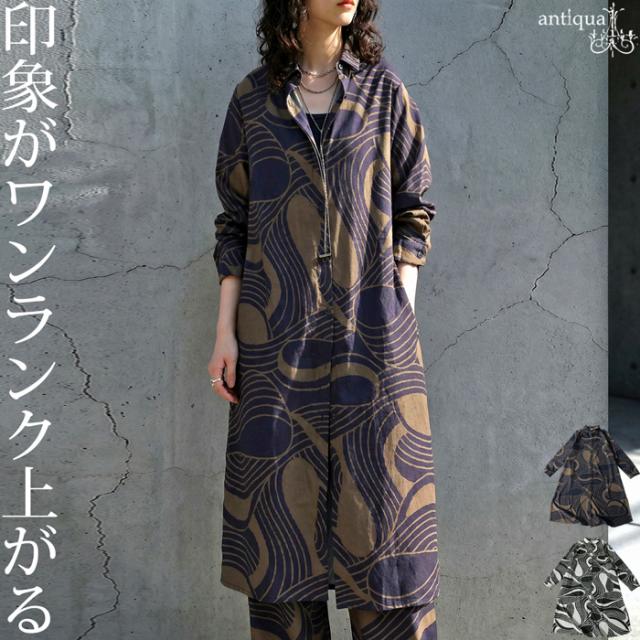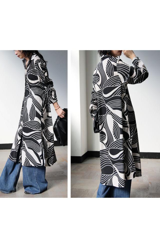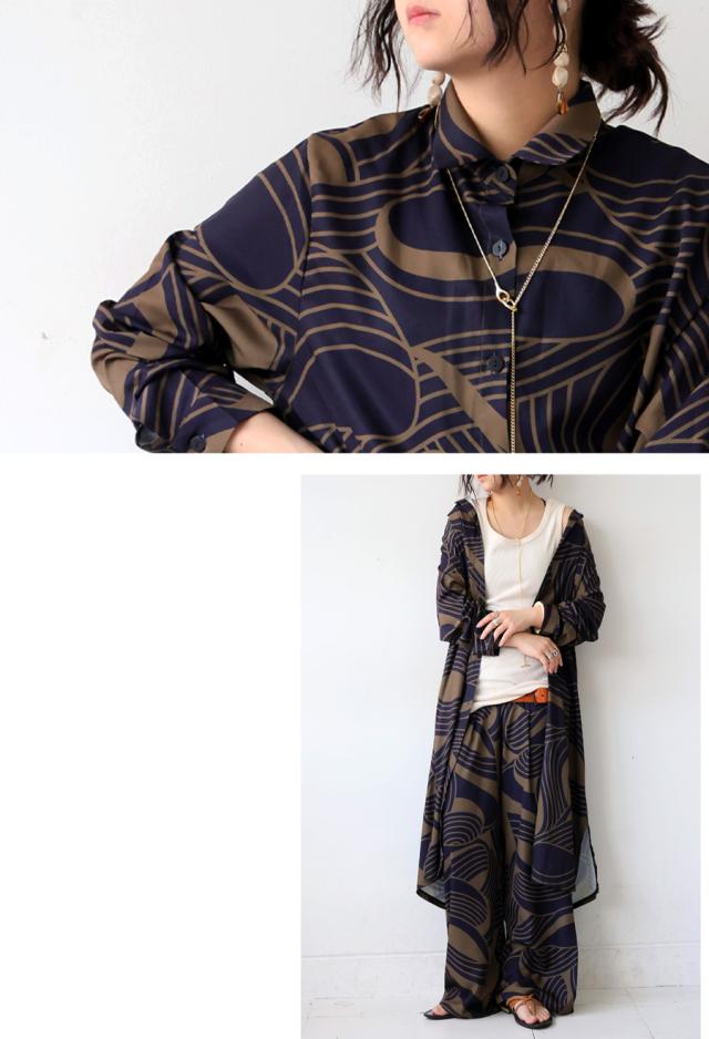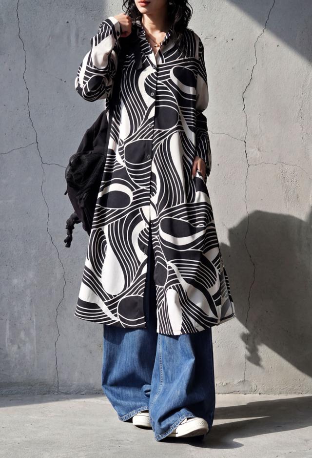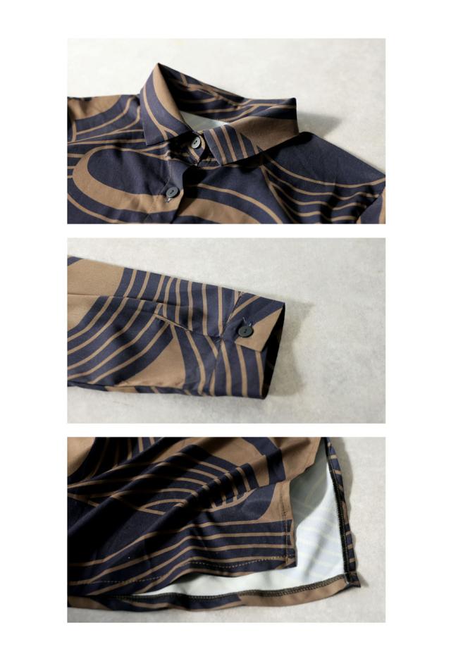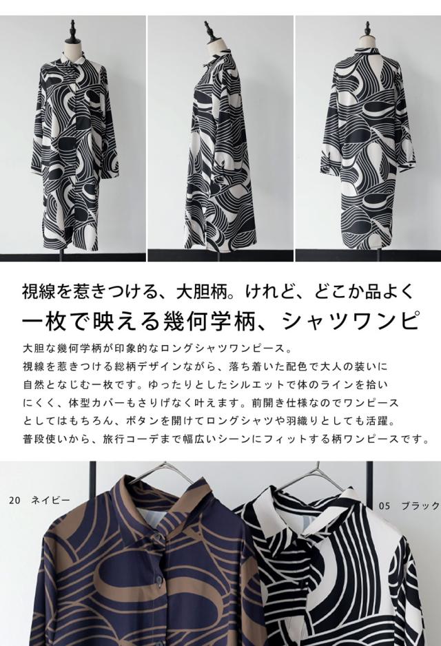 pa-03871 ワンピース シャツ 前開き 羽織り 幾何学 総柄 柄シャツ ゆったり 体型カバー 軽量 速乾 レイヤード セットアップ モード カジュアル 上品 フレア Iライン きれいめ