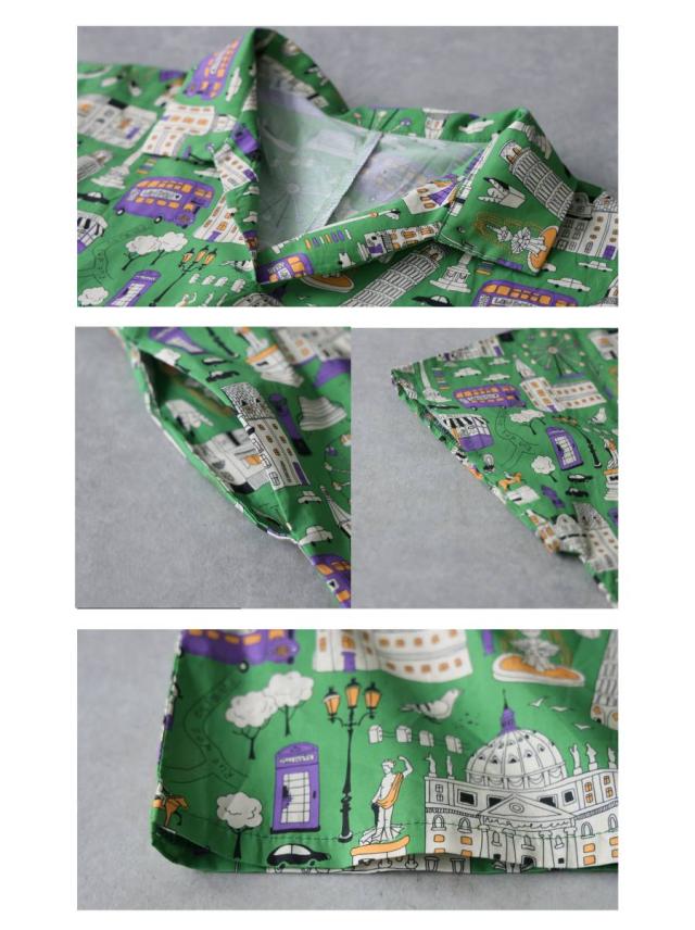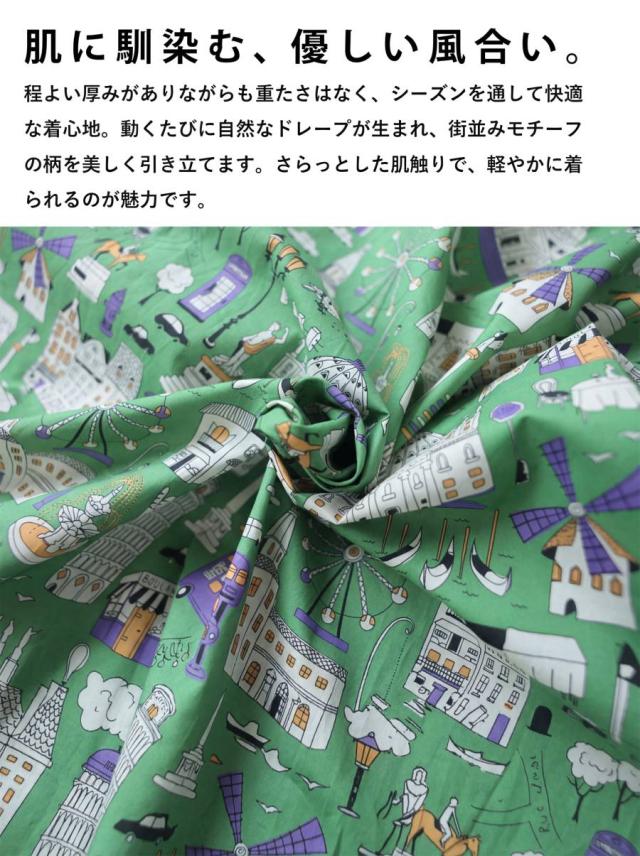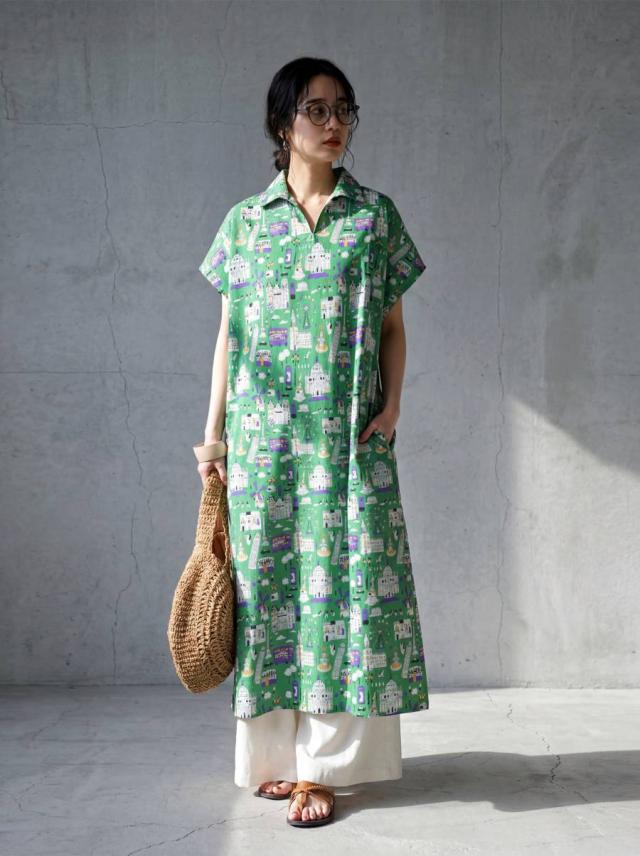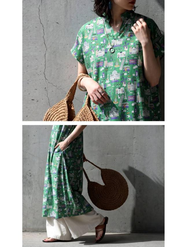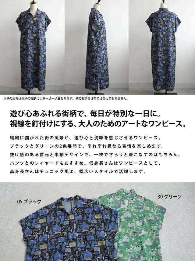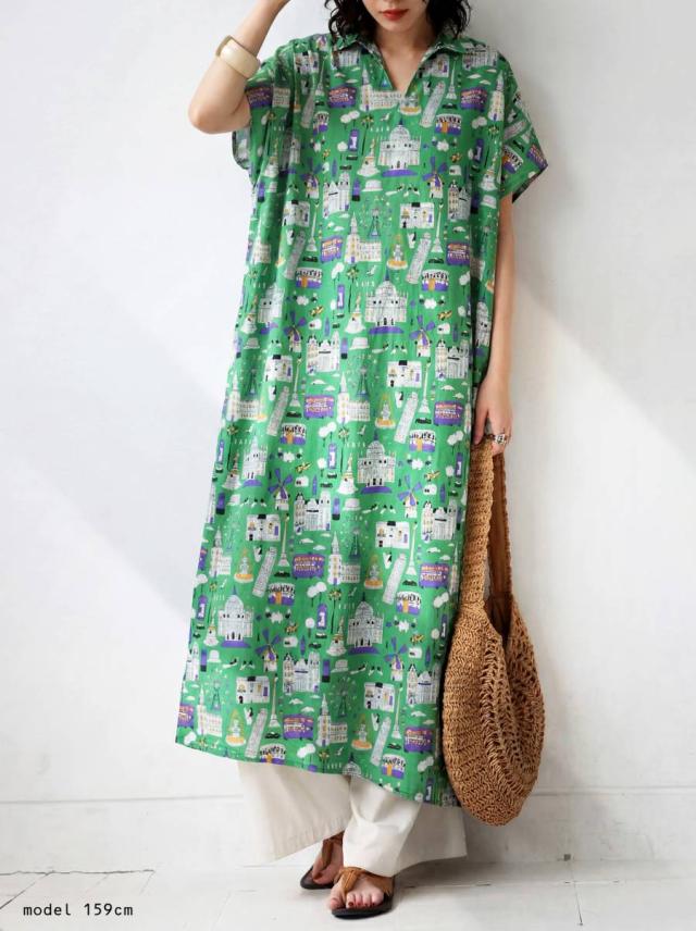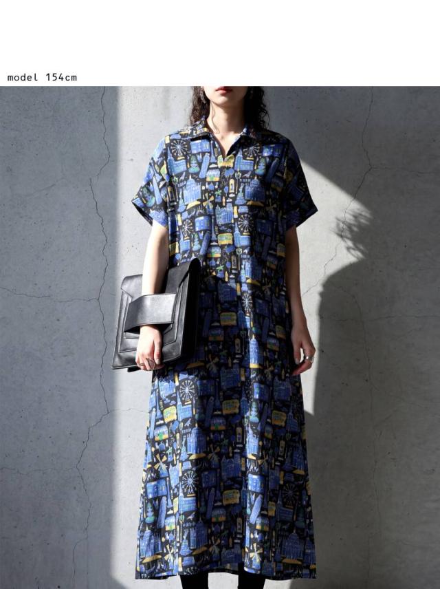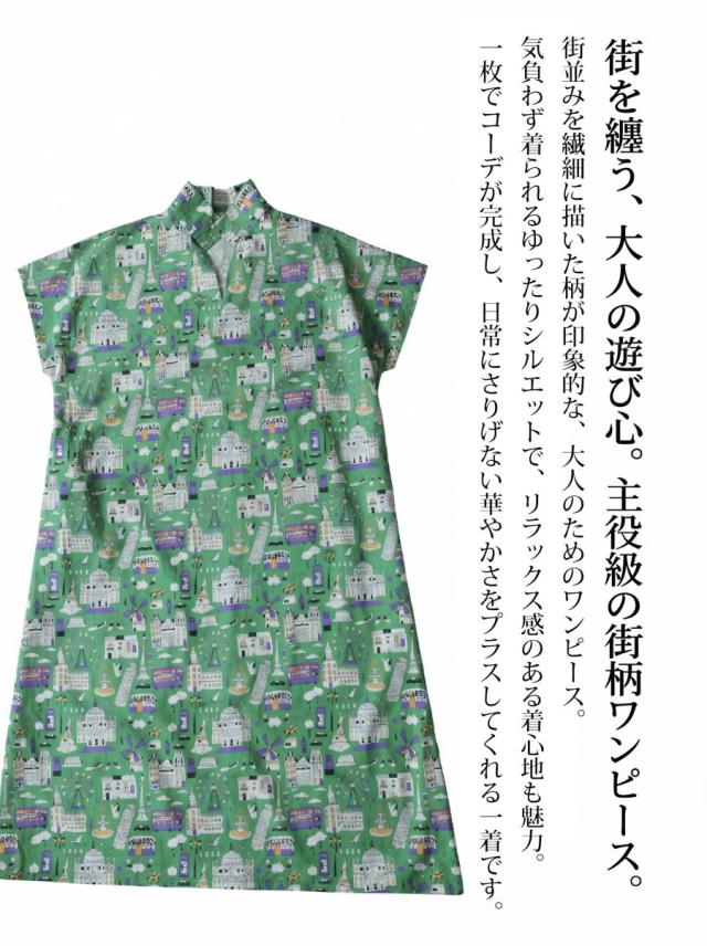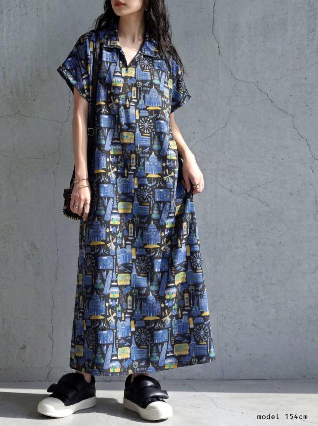 遊び心のある街並みモチーフ(街柄 総柄)が印象的な、存在感のあるロングワンピースです。