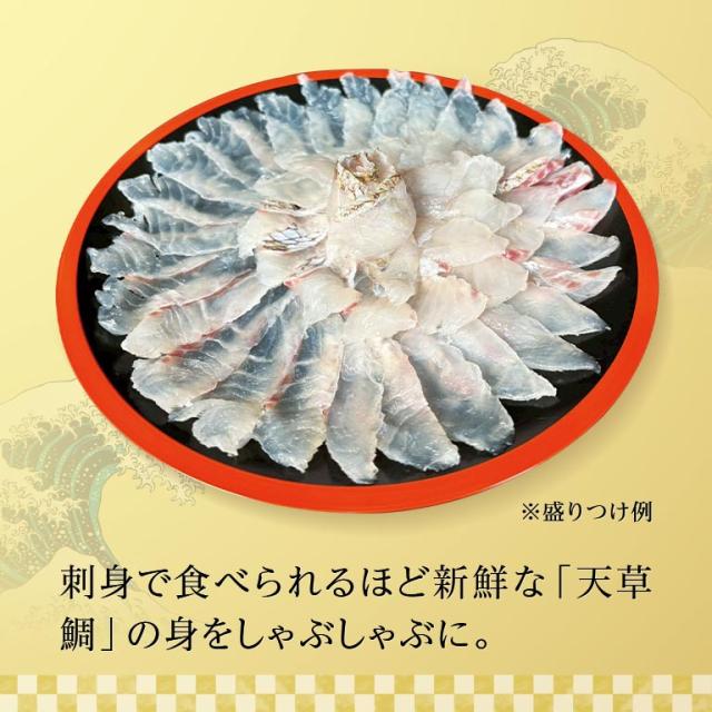 刺身で食べられるほど新鮮な「天草鯛」の身をしゃぶしゃぶに最適な厚みにカット。ダシ汁を泳がせれば身がキュッと締まり、新鮮な鯛の甘みがお口いっぱいに広がります。鯛めしにしても最高です。