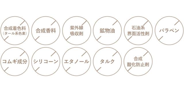 合成着色料(タール系色素)、合成香料、紫外線吸収剤、鉱物油、石油系界面活性剤、パラベン、コムギ成分、シリコーン、エタノール、タルク、合成酸化防止剤 不使用。 | ミネラルと天然由来成分100%&石けんでオフ