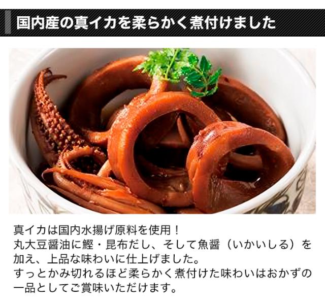 真いか(国産)、しょうゆ、砂糖、清酒、魚醤、こんぶ調味液、かつお節調味液、しょうが、(一部に小麦・いか・大豆を含む) |