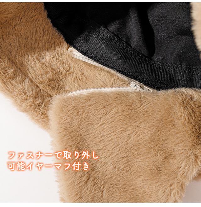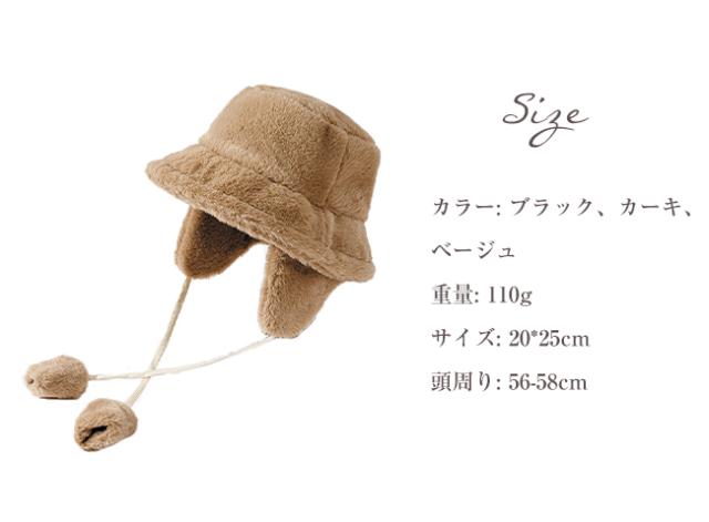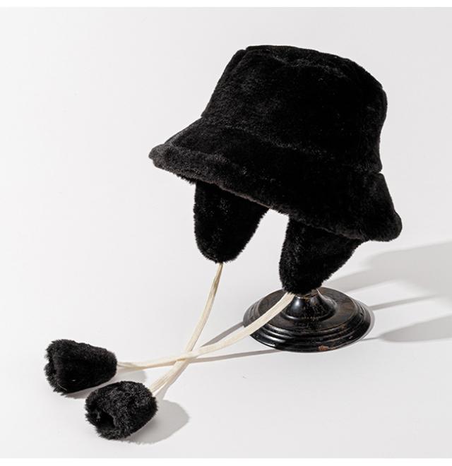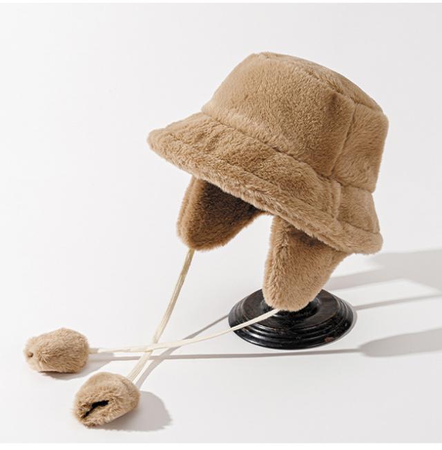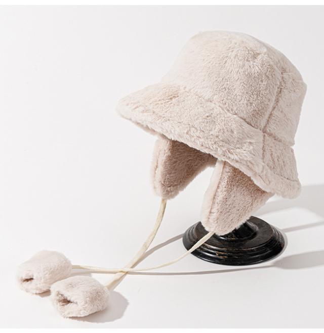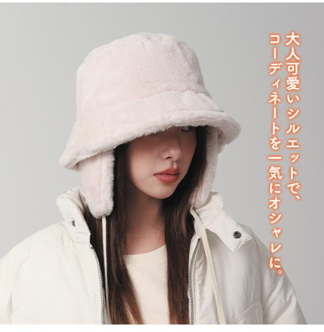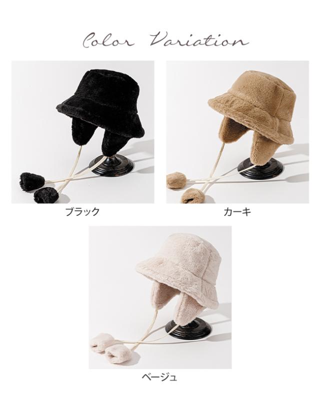 もこもこ可愛いポンポン&イヤーマフ付きファーバケットハット。