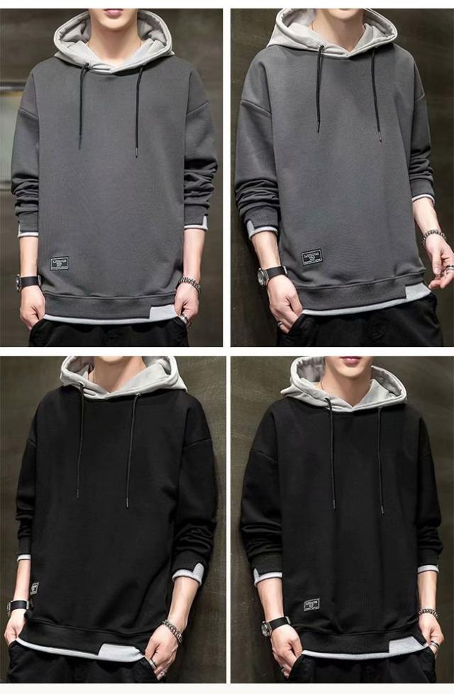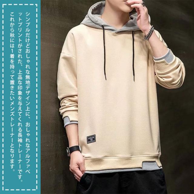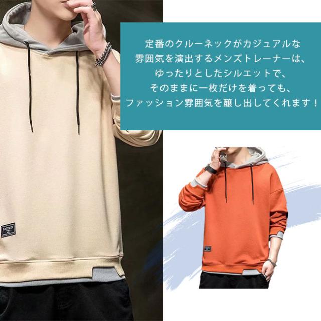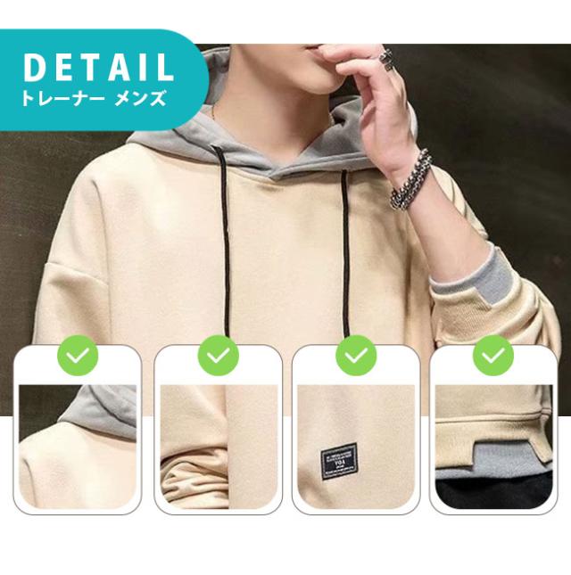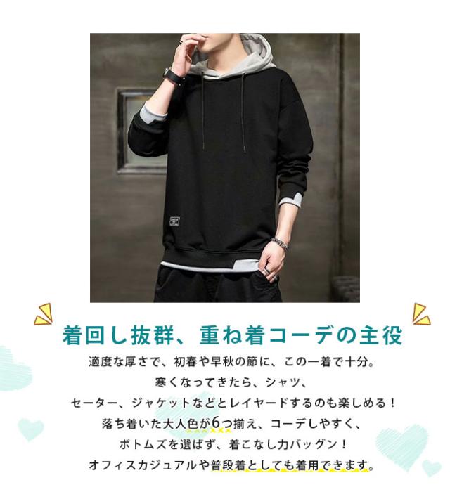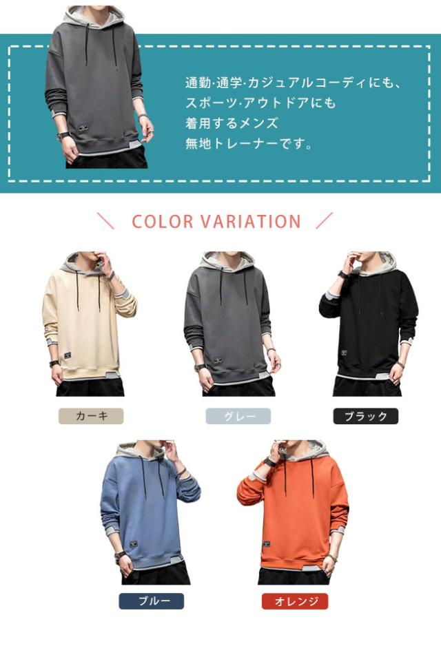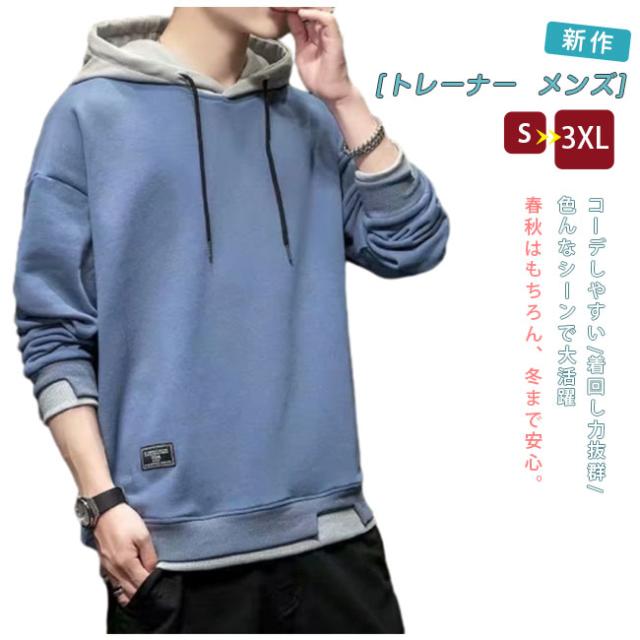 トレーナー メンズ 長袖 パーカー フード付き 重ね着風トップス 無地 おきいサイズ スウェットカジュアル 柔らかい 秋服 ゆったり 快適 ビッグシルエット 運動 おしゃれ 春秋
