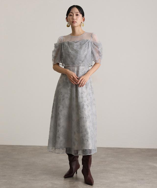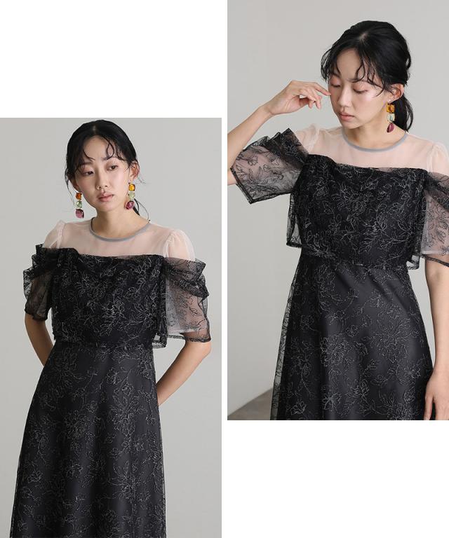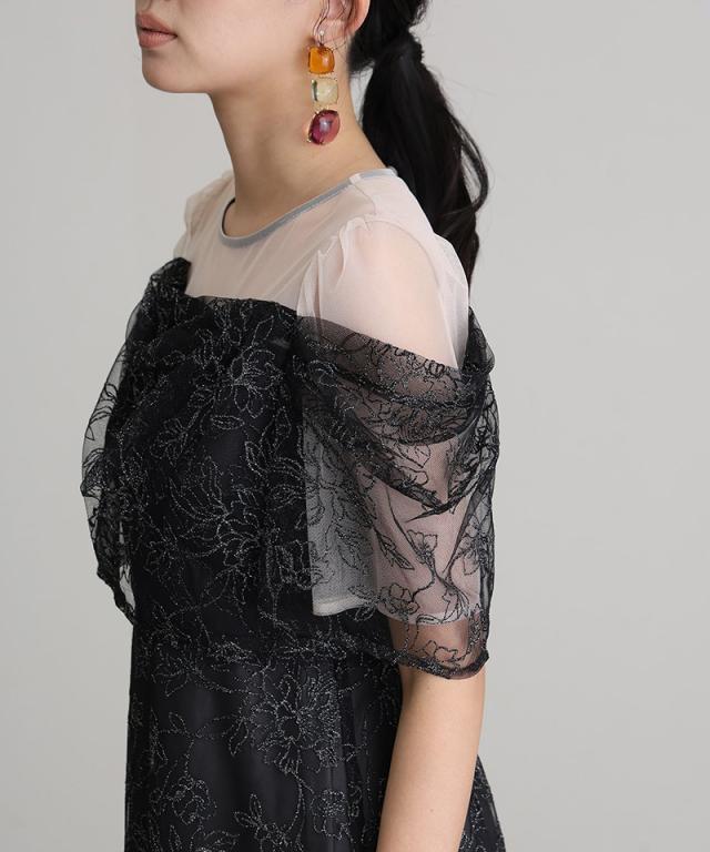 上品なラメ刺繍を施したレースが歩くたびに揺れ、華やかで印象的なシルエットを演出。