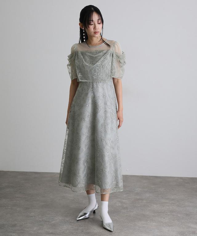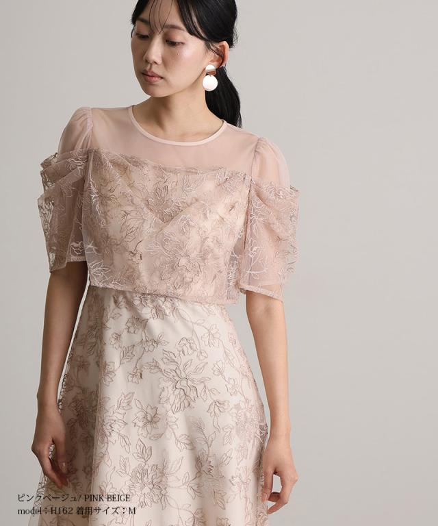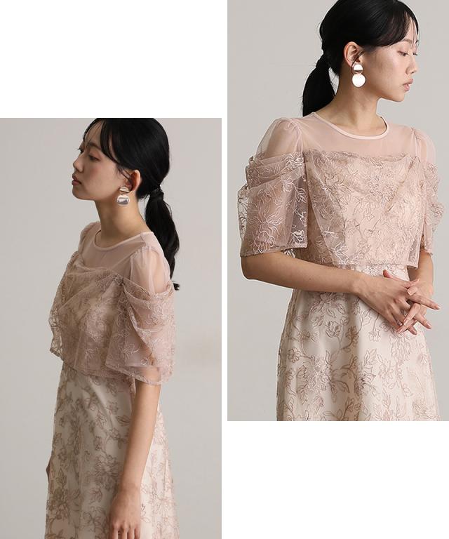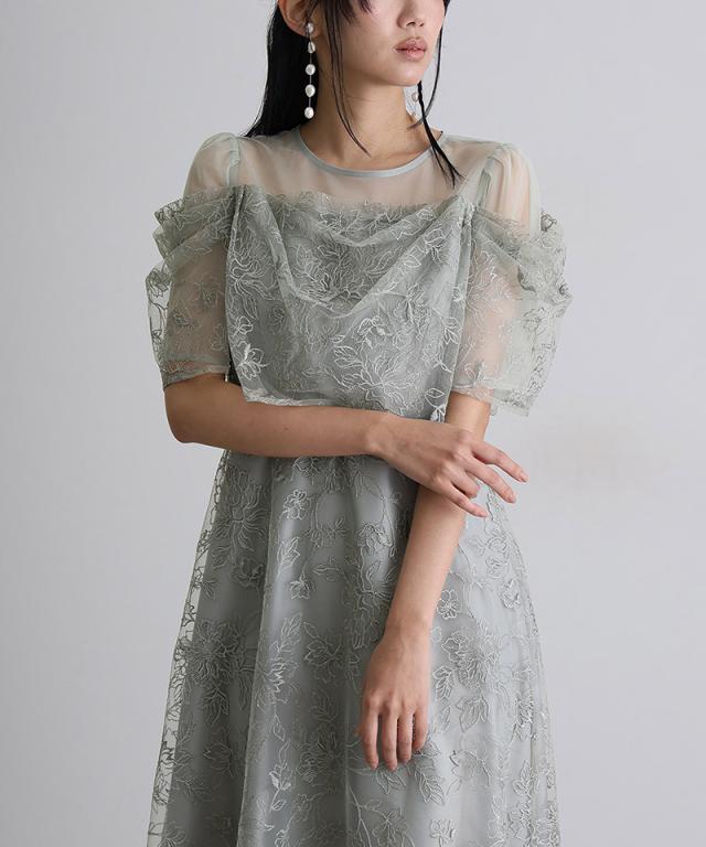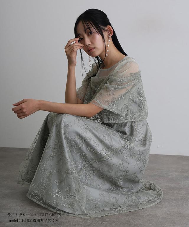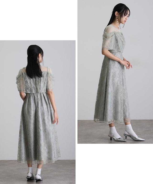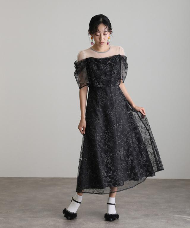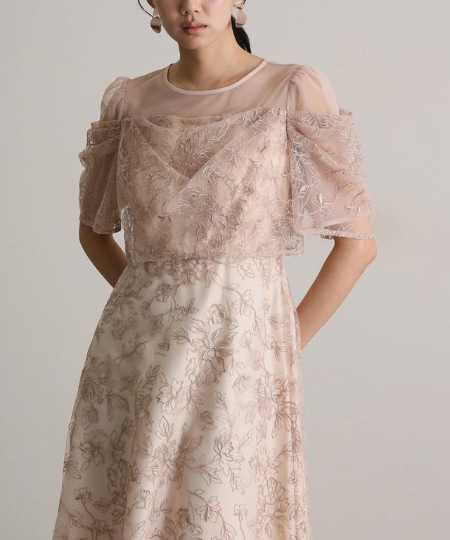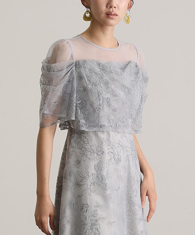ラメ糸を織り込んだ刺繍レースが、光を受けて上品に輝く華やかなドレス。