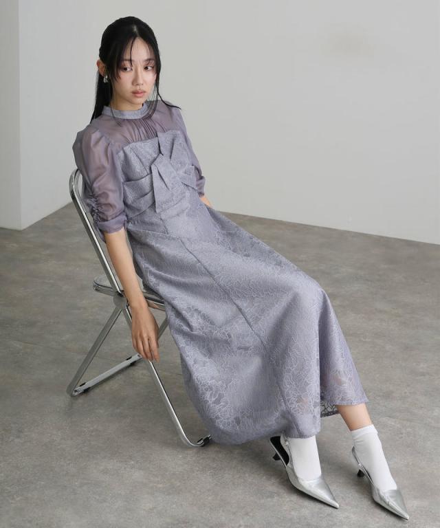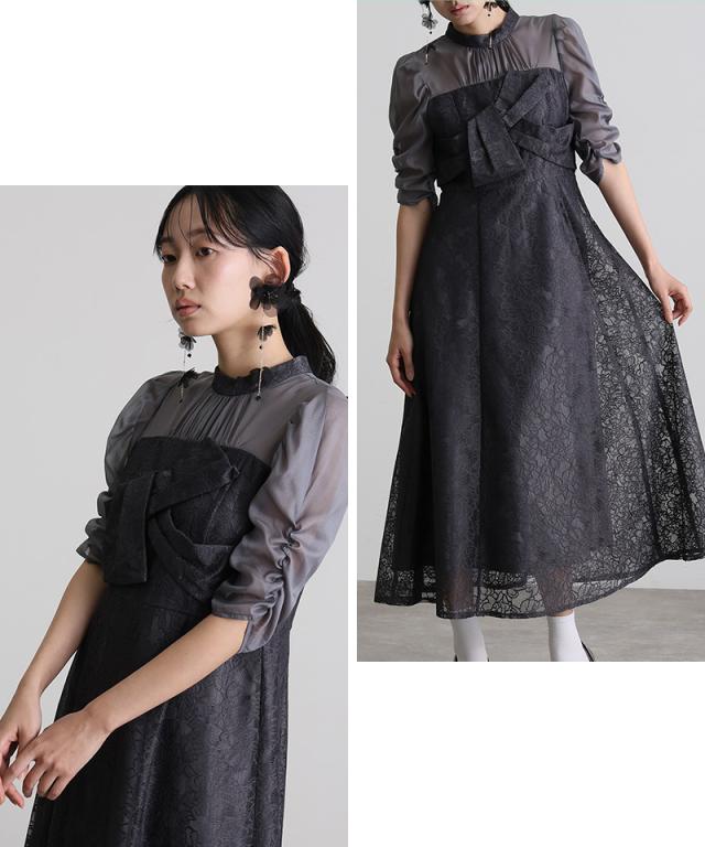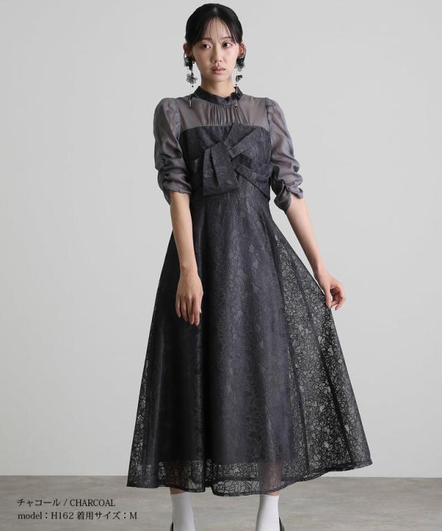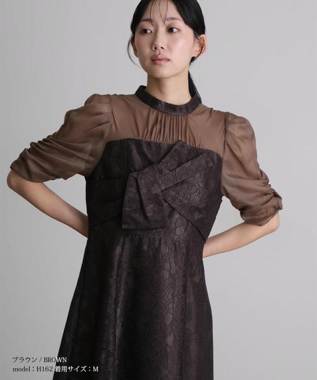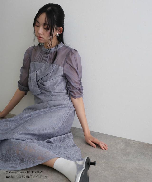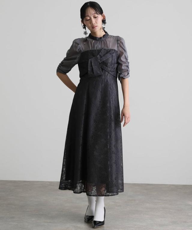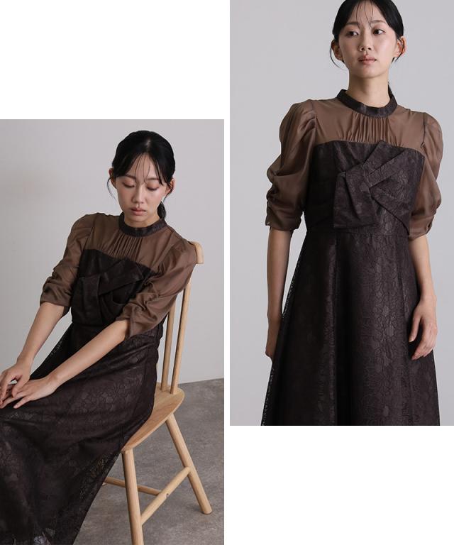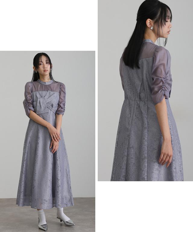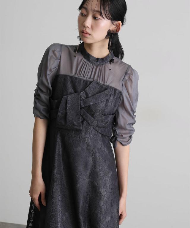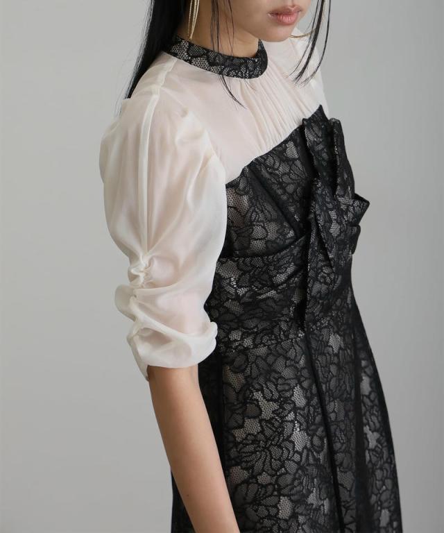 デコルテから袖にかけてのオーガンジー素材で軽やかな抜け感を演出。