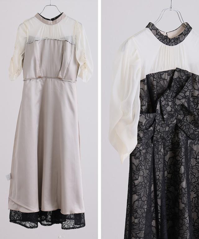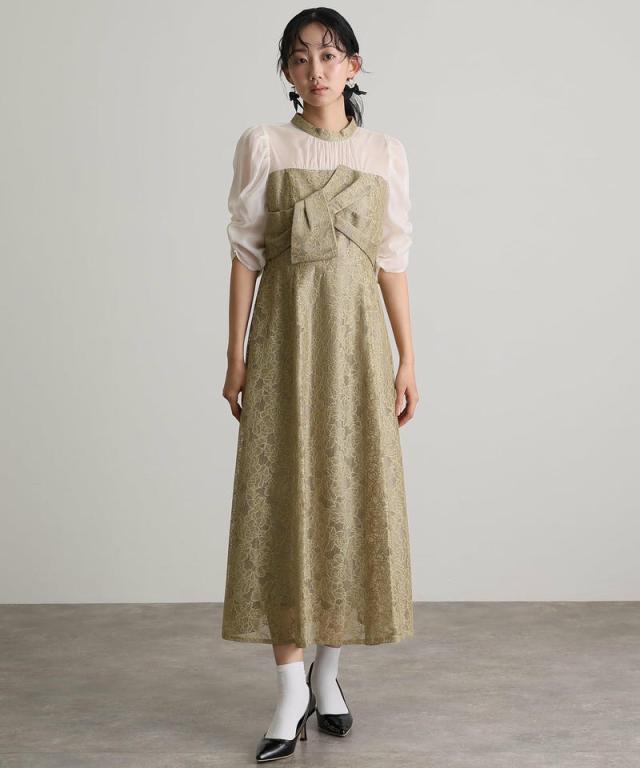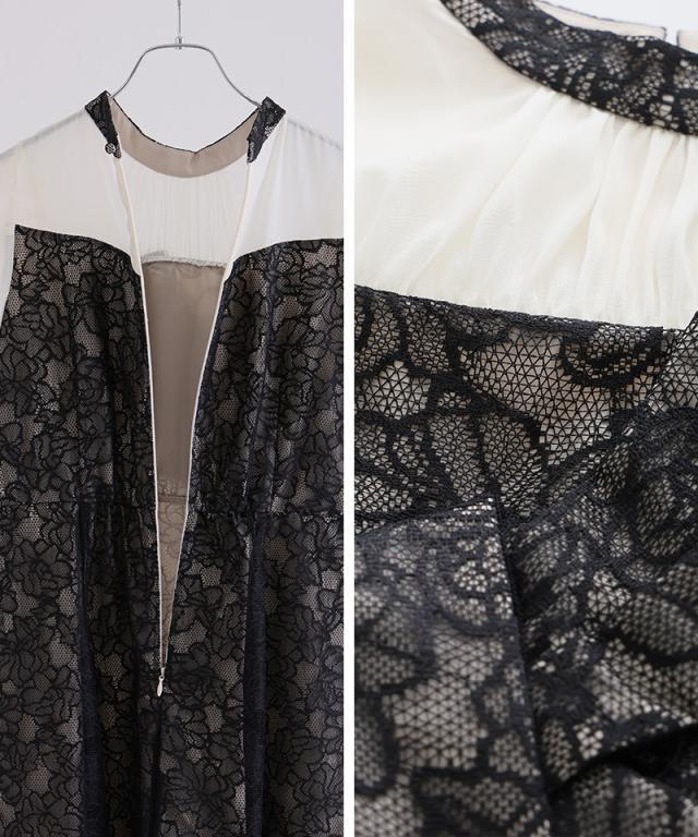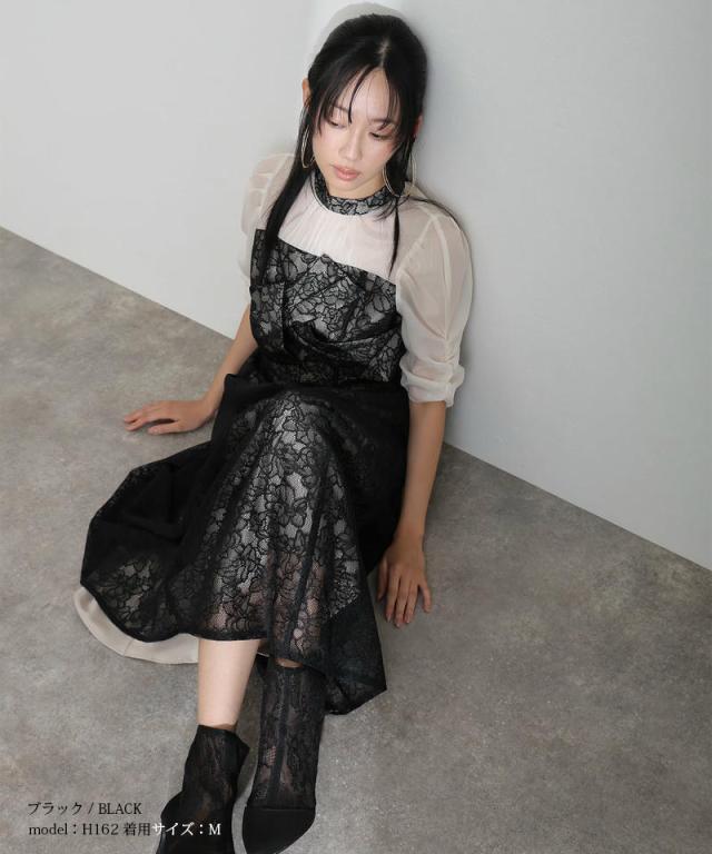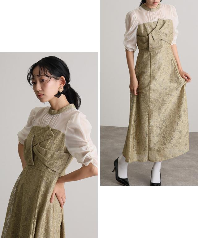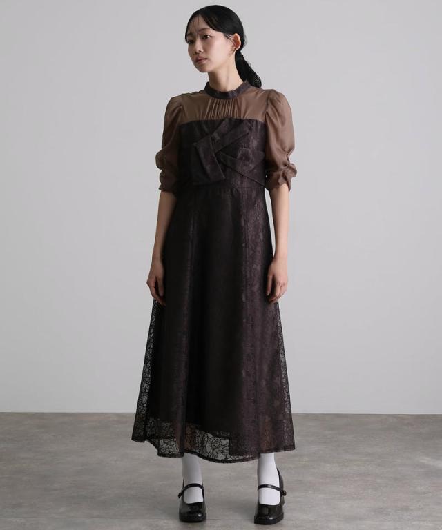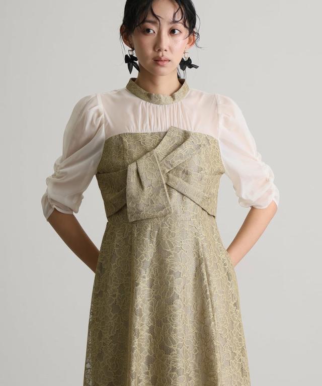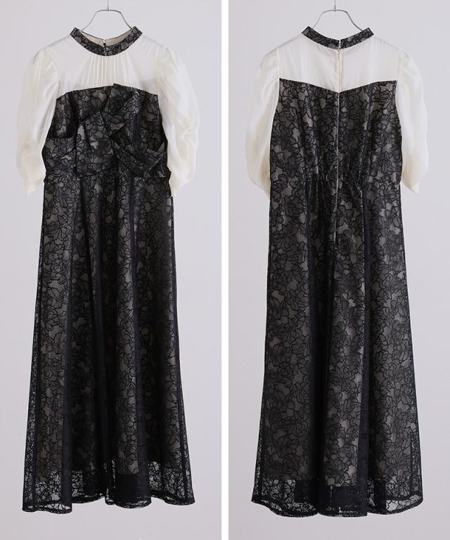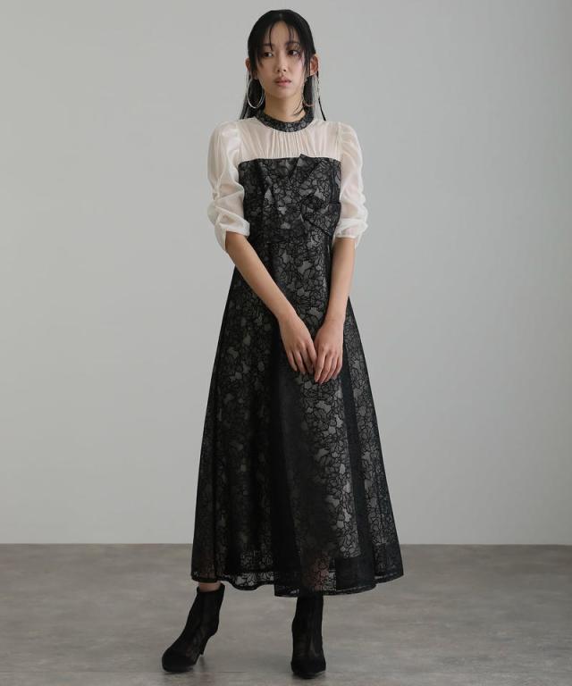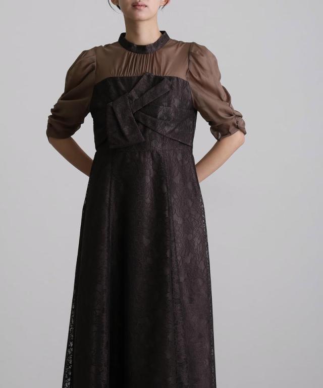 デコルテから袖にかけてのオーガンジー素材で軽やかな抜け感を演出。