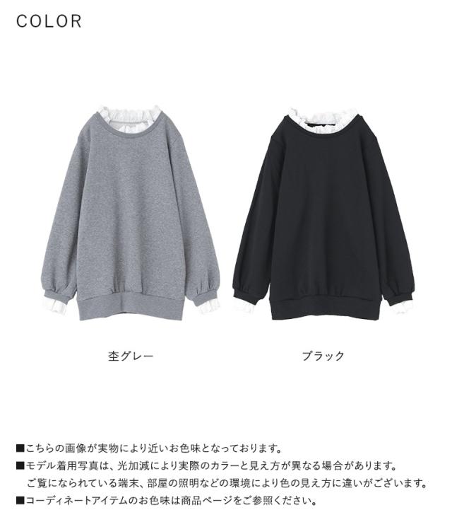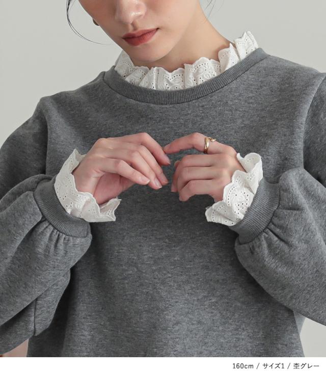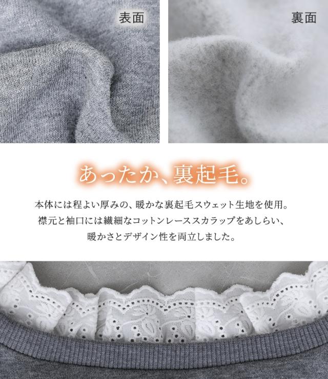 <冬新作>『裏起毛レースフリルプルオーバー』【メール便不可】【20】[スウェット 裏起毛 レディース トップス 長袖 トレーナー プルオーバー スエット コットンレース ぽわん袖 あったか 秋 冬]