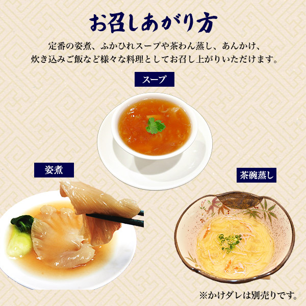 サメヒレ、鰹ダシ、生姜、ネギ ※原材料に、小麦、大豆、鶏を含む