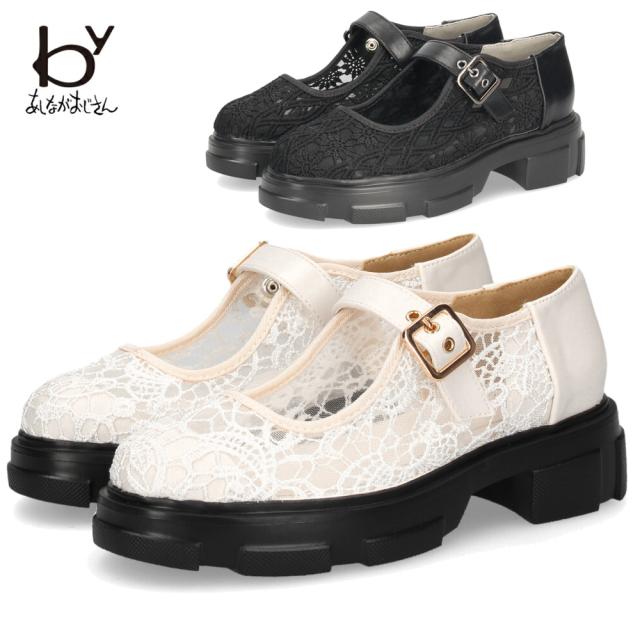 カジュアルシューズ レディース 靴 軽量 厚底 レース ストラップシューズ おしゃれ かわいい 疲れにくい byあしながおじさん 8940329 ブラック 黒 アイボリー