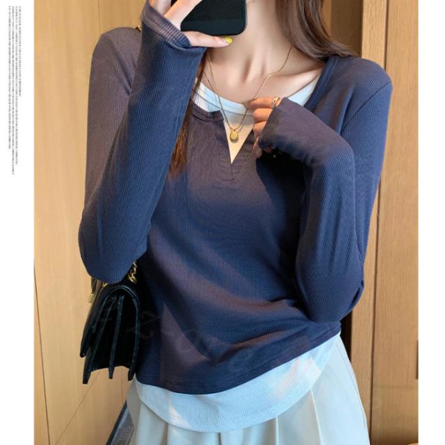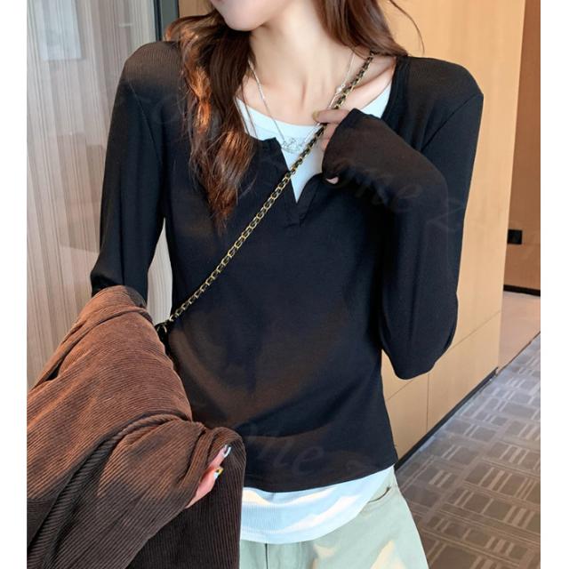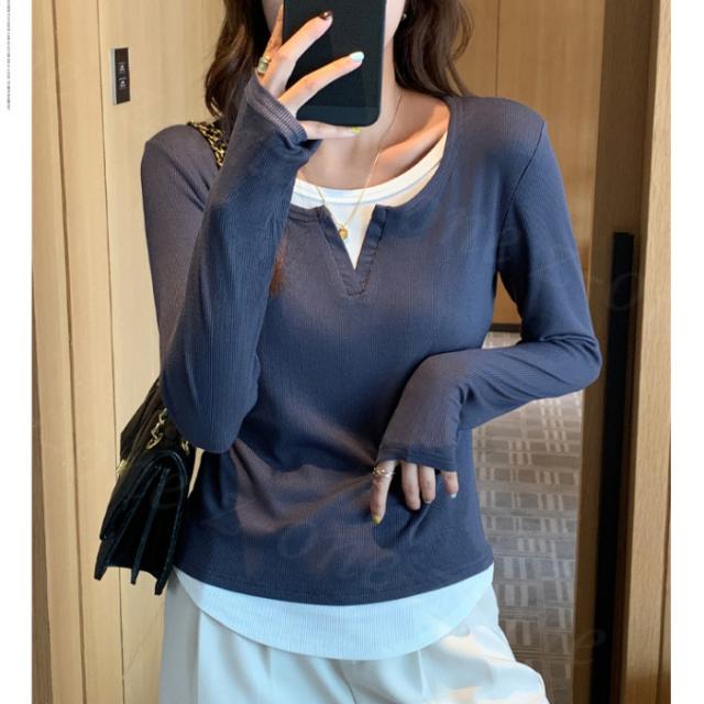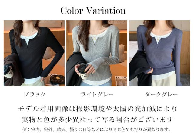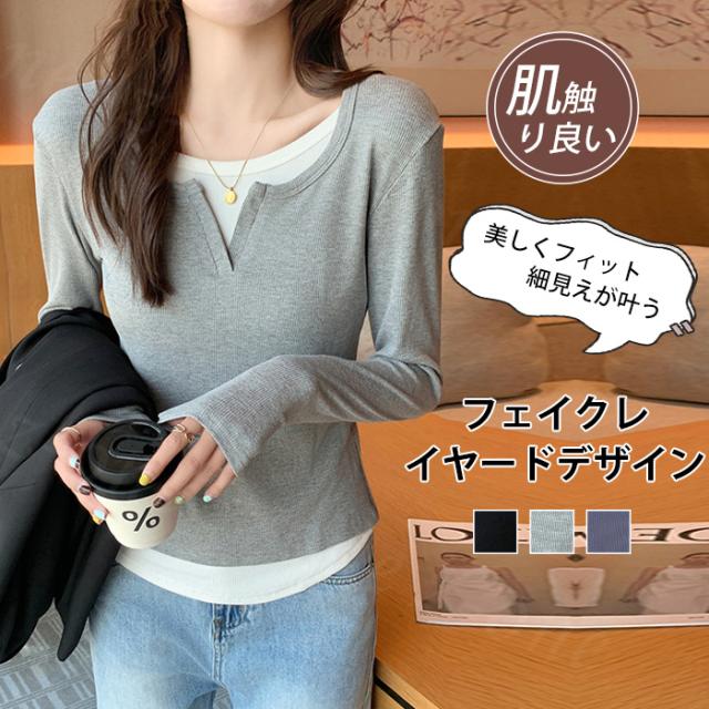 カットソー フェイクセットアップ フェイクレイヤード コントラストカラー 長袖 Tシャツ 秋冬 春新作 レディース インナー ラウンドネック リブ編み シャツ スリム見え トップス ファッション プルオーバー カジュアル シンプル 入学式 入園式