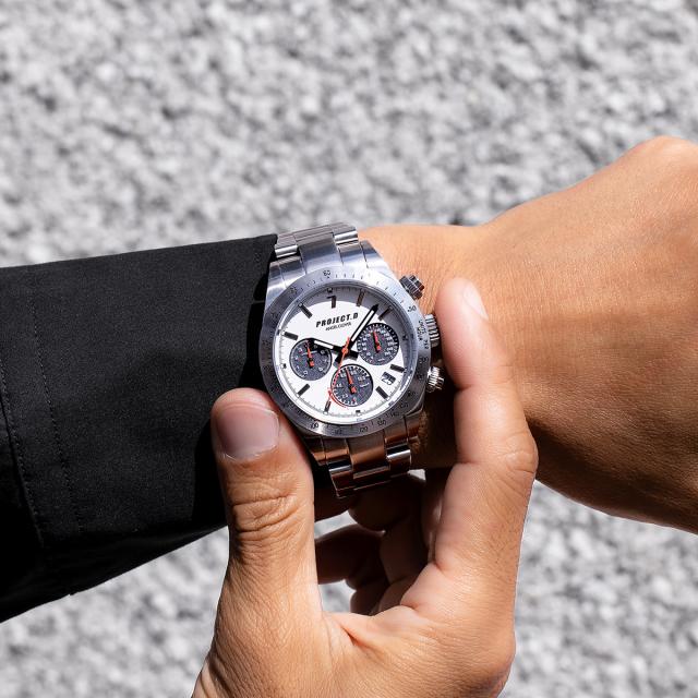 ムーブメントには、日本製ソーラークオーツ「SEIKO EPSON VR42」を搭載。光をサブダイヤルから効率的に取り込み、フル充電で最大約4ヶ月間駆動します。クールなシルバーフェイスとステンレスベルトが、涼介の知的で研ぎ澄まされた印象を体現。