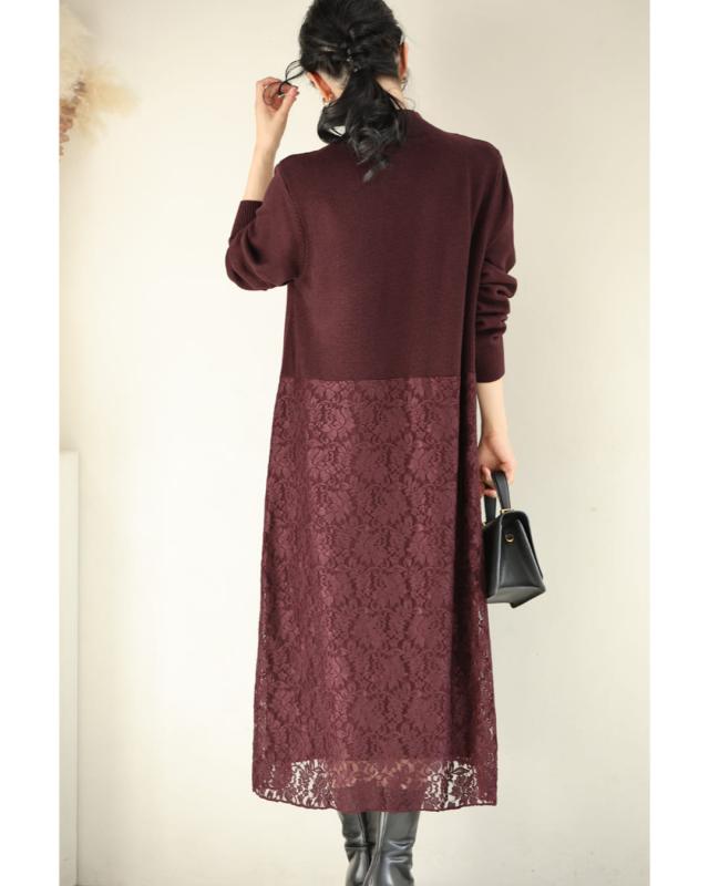 再入荷11月29日 (予約 12/15〜12/30前後の出荷予定) 深まるボルドーのレース合わせニットミディアムワンピース cawaii w61593ps S~2L対応 ハイネック 日常使い 上品 フォーマル 伸縮 大人可愛い おしゃれ 体型カバー レディース ファッション 30代 40代 50代 60代