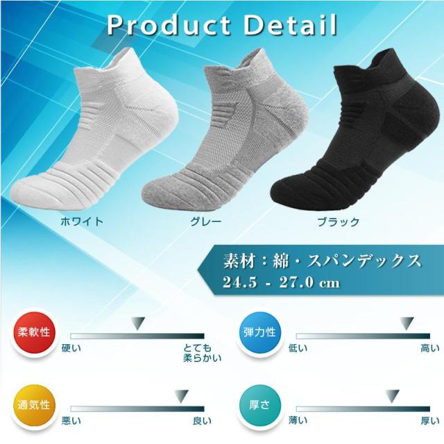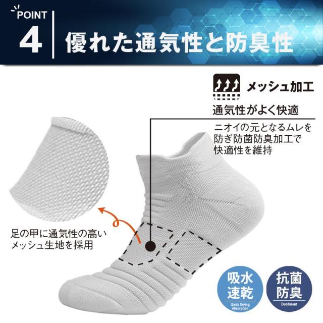 高質な綿素材で肌にやさしく、快適な履き心地です。吸水速乾、抗菌防臭加工、メッシュ加工により通気性がよく足元を清潔に保ち臭いを防ぎます。長時間の運動や立ち仕事にも最適な靴下です。