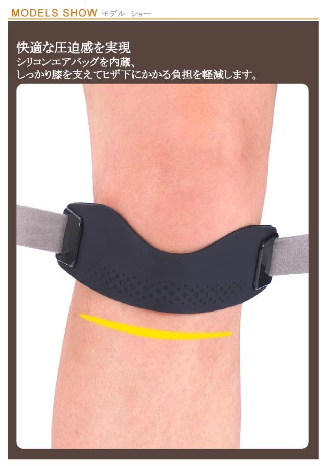| 2個セット ずれない/膝への負担軽減 バンド式膝蓋骨サポーター 快適な圧迫感を実現 シリコンエアバッグを内蔵、しっかり膝を支えてヒザ下にかかる負担を軽減します。 シリコンエアバッグ +放熱スリット 膝を全方位から立体的にサポートしながら、シリコン素材の通気溝が熱とムレを見逃す 「3Dクールサポートシステム」。 動きに強く45°滑り止めツイル設計 着用時のボールド感もバッチリで、よく動く膝でもズレを防止します。 加圧自在・快適な装着感 高弾性フェルト素材かつベルクロデザイン、左右を引き締めるだけで症状や痛みに合わせた加圧調節が可能です。 ABS樹脂製フック 軽量で金属風仕上げ、冬場でも冷たさを感じません。 見た目もスタイリッシュ スタイリッシュかつ機能性に優れた逸品! | |