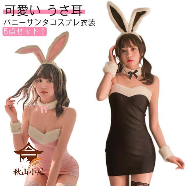 【送料無料】【5点セット】 サンタ コスプレ バニーガール コスプレ 衣装 仮装 ワンピース ミニ サンタコス クリスマスコスプレ バニー サンタクロース コスチューム レディース うさぎ ウサギ 耳 セクシー かわいい ドレス ピンク 黒 ハロウィン イベント パーティー