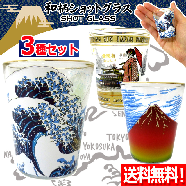 高品質ガラス製和柄ショットグラス3種セット 神奈川沖浪裏 赤富士 日本 和テースト スピリッツ 日本酒 ウイスキー テキーラ ウォッカ JAPAN