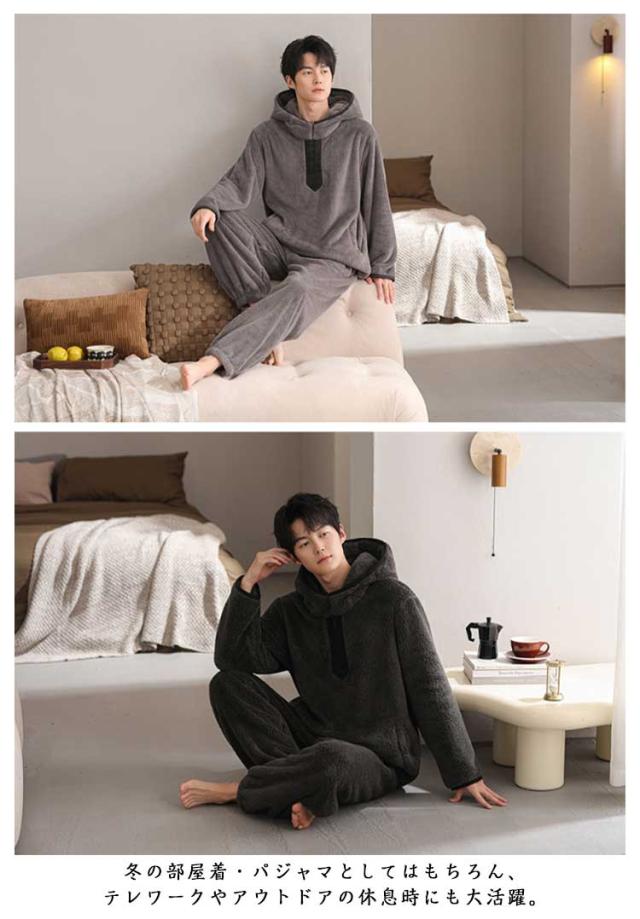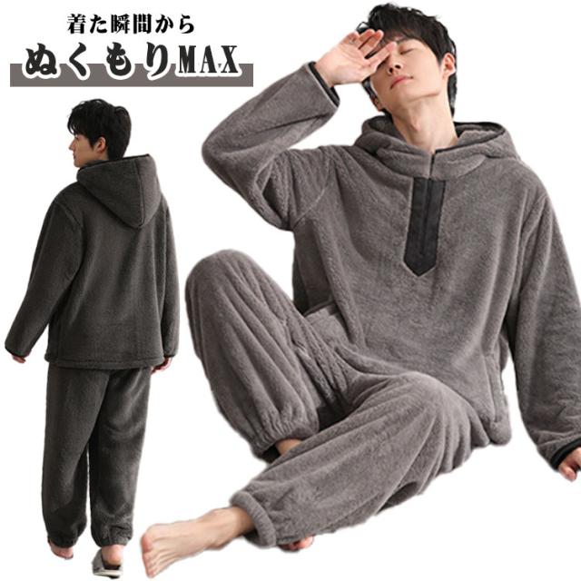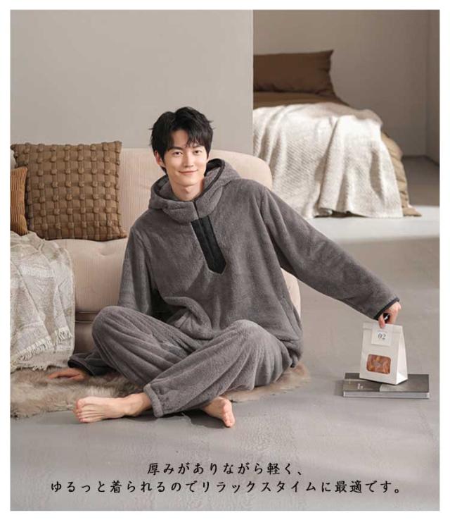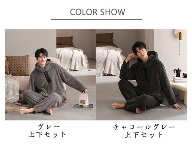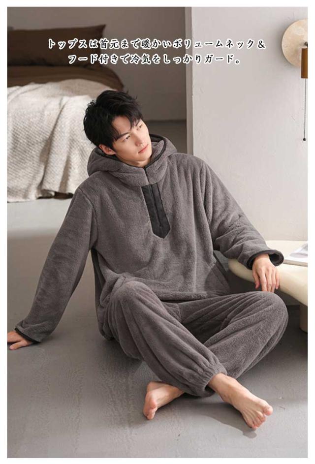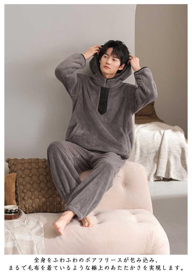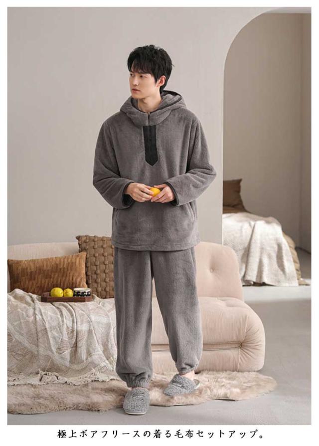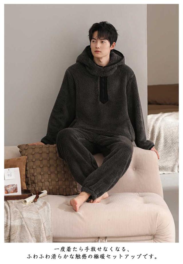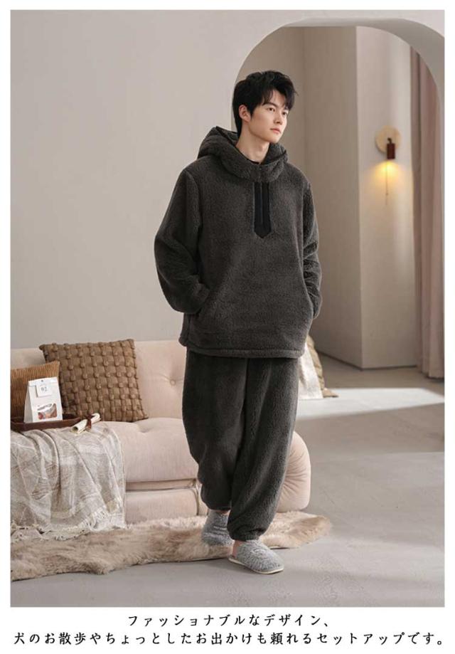 フード付き セットアップ 暖かい 長袖 メンズ 上下セット もこもこ 厚手 裏起毛 パジャマ ルームウェア ボアフリース ボアフリース ふわふわ 着る毛布 ファーフリース 冬 部屋着 おしゃれ ボリュームネック 韓国パジャマ レディース