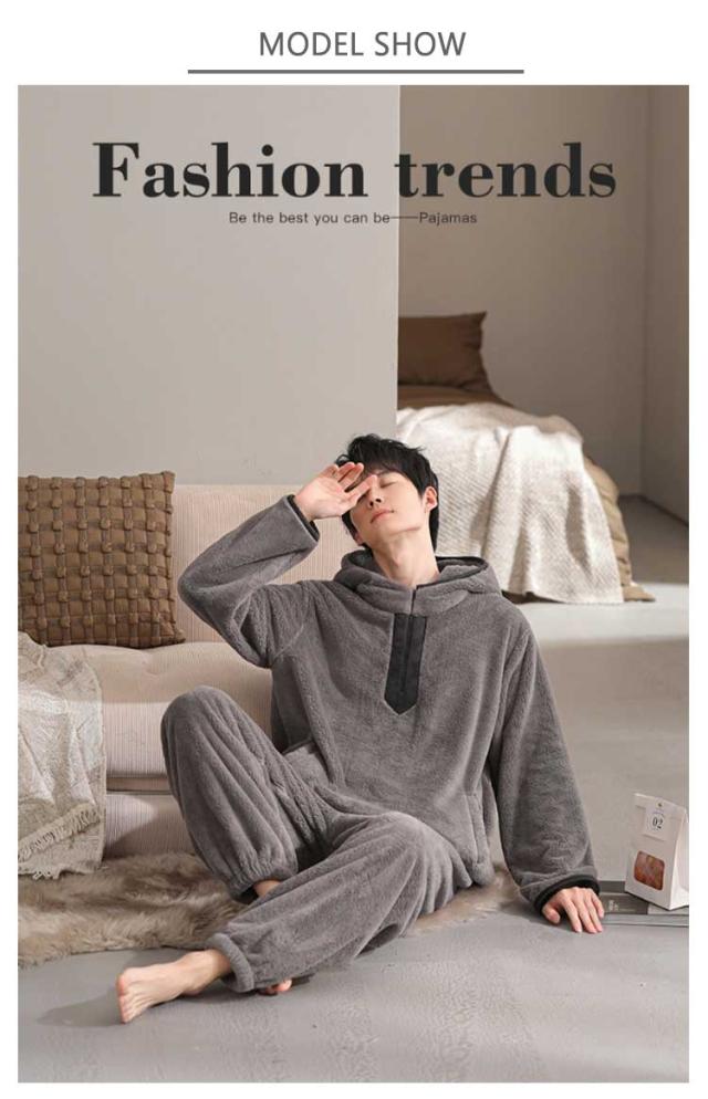 - 厚手起毛パジャマセット、ゆったり襟で快適