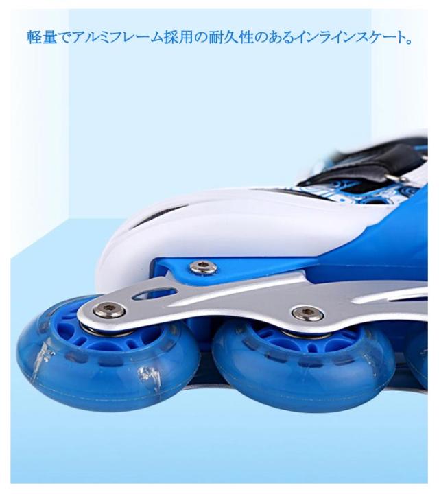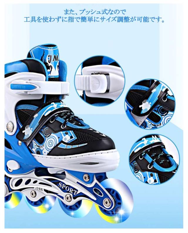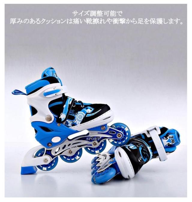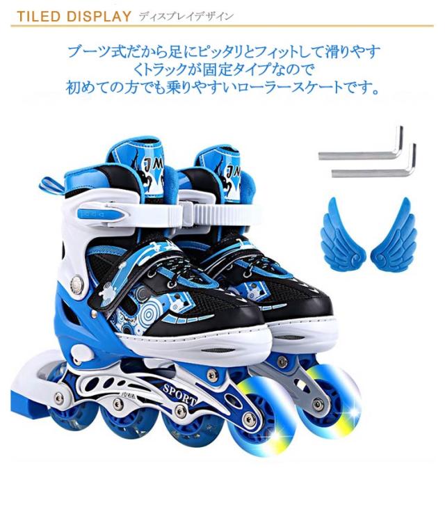 | 光る輪のブーツ式のインラインスケートです。16.5-26.0cmサイズあり!お子様から大人の方までお楽しみいただけます。 ブーツ式だから足にピッタリとフィットして滑りやすくトラックが固定タイプなので初めての方でも乗りやすいローラースケートです。 軽量でアルミフレーム採用の耐久性のあるインラインスケート。 ブーツは通気性の良いナイロンメッシュ素材で蒸れにくい。 サイズ調整可能で厚みのあるクッションは痛い靴擦れや衝撃から足を保護します。 また、プッシュ式なので工具を使わずに指で簡単にサイズ調整が可能です。 お子様から大人の方までお楽しみいただけます。広場、公園などの広い場所で簡単に運動をできます。記念日、誕生日などのお祝い・贈り物(ギフト)にも適応です。 | |