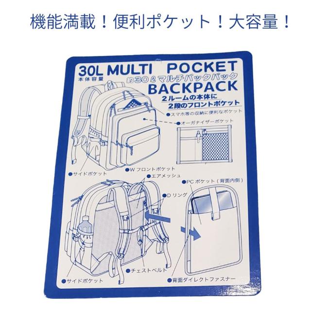 | ポケット | サイズ 約W31×H45xD20cm 重量 約600g 容量 約30L 素材 ポリエステル ポケット:両サイドメッシュポケットx2 (外前面ファスナーポケットx1) (内)×5ペン差しx1パソコン入れx1 |