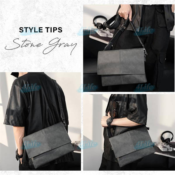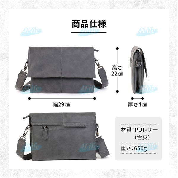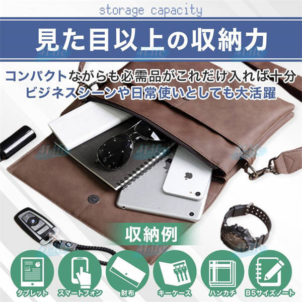 ビジネスシーンにふさわしい上品なデザインと、実用性を兼ね備えたPUレザーショルダーバッグ。A5ノートや長財布、スマートフォンなど必要なものを無駄なく収納できる29×20×4cmの絶妙なサイズ感。手にした瞬間にわかる軽さと柔らかさは、通勤や外回りで活躍するビジネスマンの頼れる相棒に。スーツにも私服にも合わせやすいシンプルなデザインで、あらゆる年代の男性に幅広く対応。ブラック・グレー・ブラウンの3色展開で、シーンに合わせた使い分けも可能です。この機会にぜひ、ワンランク上のビジネスバッグを体感してください。