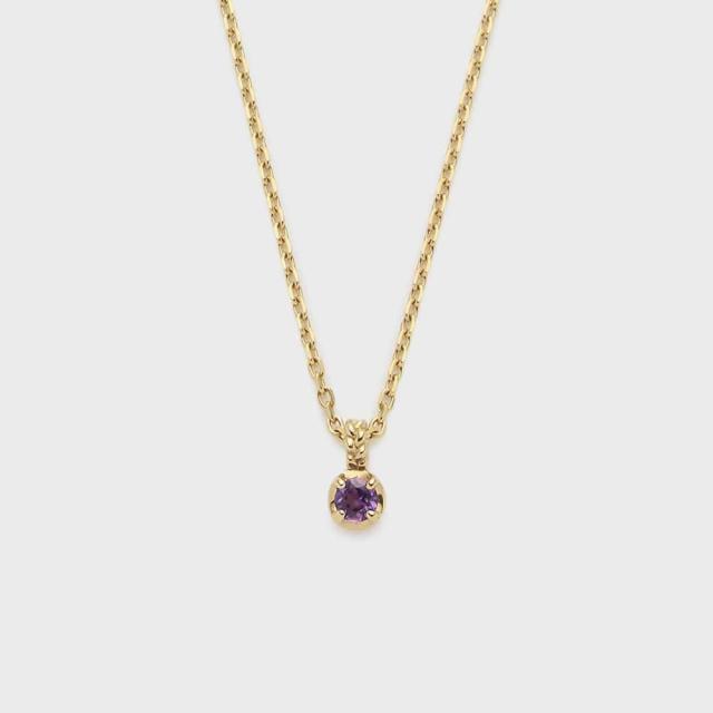 天然石を包み込む石座は丸みを持たせたキュートなシルエット。華奢なフォルムに小さなアメジストがきらりと輝く、シンプルな中にひとさじの個性を添えたネックレスです。豊富なカラーバリエーションの中から、重ね着けを楽しむのもおすすめ。繊細な糸を三つ編みした模様のバチカンがポイント。※天然石や天然素材を使用しているものは、サイズ・色味・風合いの違いや、若干の傷、内包物の有無などに個体差があります。予めご了承ください。