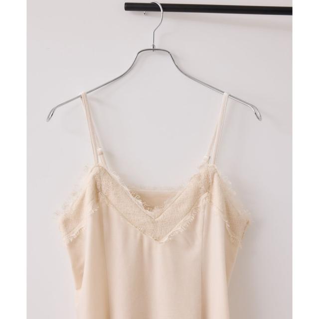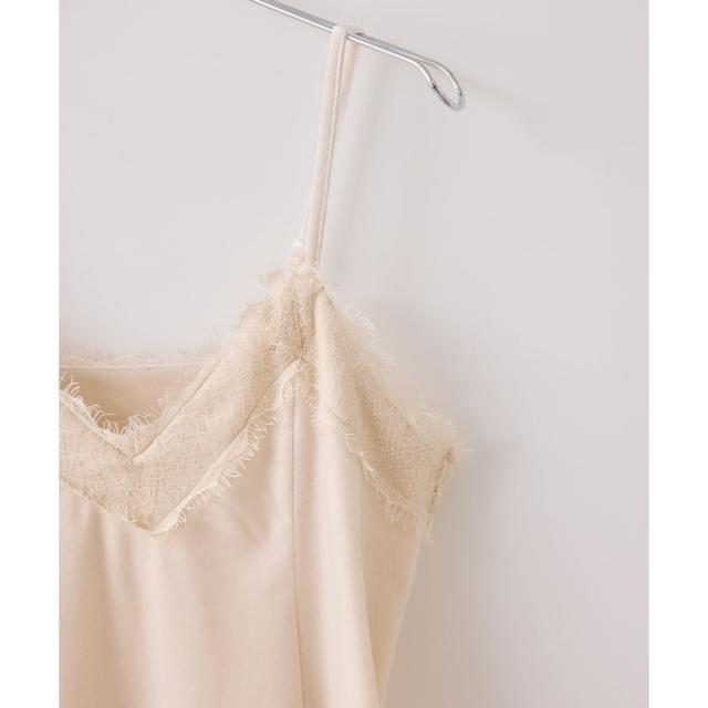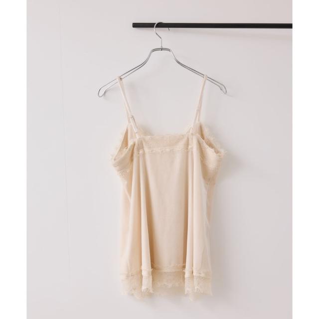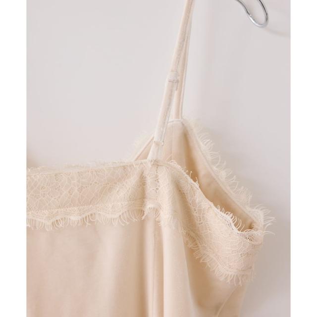 襟ぐりと裾に繊細なレースを付けたベロアキャミソール。