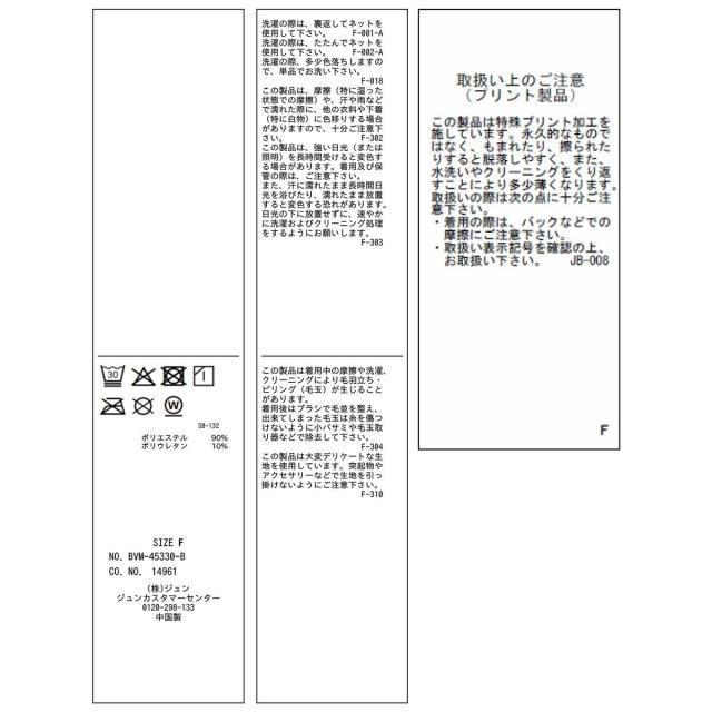 ■お手入:洗濯機|漂白不可|タンブル乾燥不可|自然乾燥|アイロン仕上げ不可|ドライ不可|ウエットクリーニング可