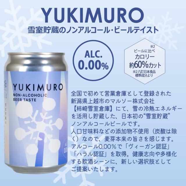 YUKIMURO・・全国で初めて営業倉庫として登録された新潟県上越市のマルソー株式会社【柿崎雪室倉庫】にて、雪の冷熱エネルギーを活用し貯蔵した、日本初の“雪室貯蔵”ノンアルコールビールです。人口甘味料などの添加物不使用(炭酸は除く)なので、麦芽本来の旨さを感じます。アルコール0.00%で「ヴィーガン認証」「ハラル認証」を取得。健康志向や多様化する飲酒シーンに、新しい選択肢としてご提案いたします。 |