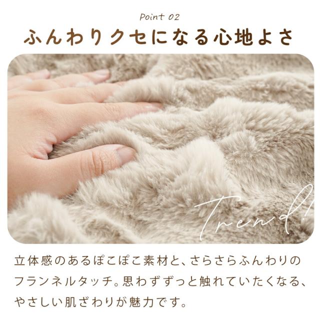 ・お財布にやさしいお得な毛布 大量に仕入れた商品の色柄を当店おまかせにすることで、仕分けの手間とコストを抑え、お求めやすい価格を実現しました。 ・ふんわりクセになる心地よさ立体感のあるぽこぽこ素材と、さらさらふんわりのフランネルタッチ。思わずずっと触れていたくなる、やさしい肌ざわりが魅力です。 ・もこもこシープタッチ生地肌に触れる面には、もこもこのシープタッチ素材を使用。ふんわり包み込むようなぬくもりで、寒い季節もやさしくあたためます。 ・2枚合わせでぬくもりたっぷり2枚の生地を重ねた“二枚合わせ毛布”。空気を含んでふんわり軽く、寒い夜もやさしく包み込んであたためます。 ・洗濯機で洗えて清潔つづくポリエステル素材だから、お洗濯しても乾きやすい!ご家庭で丸洗いできて、毎日清潔にお使いいただけます。 ・いろんなシーンで使える!寝室以外にもリビングやオフィス、車の中でもマルチに使えます。みんなが使えて便利なひざ掛け毛布です。 |