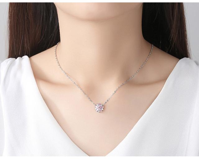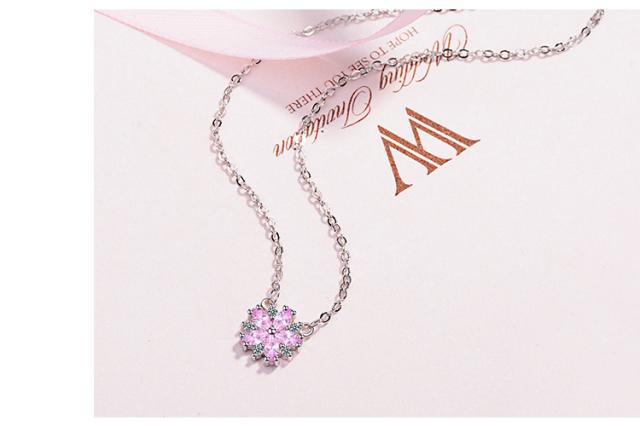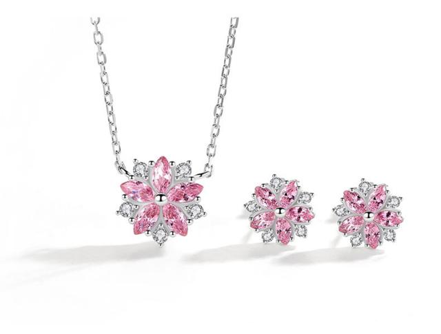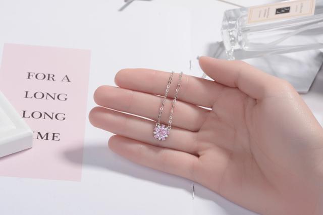 花びらのように配置されたピンクのストーンと、輝くキュービックジルコニアが胸元を華やかに彩ります。