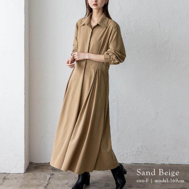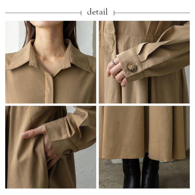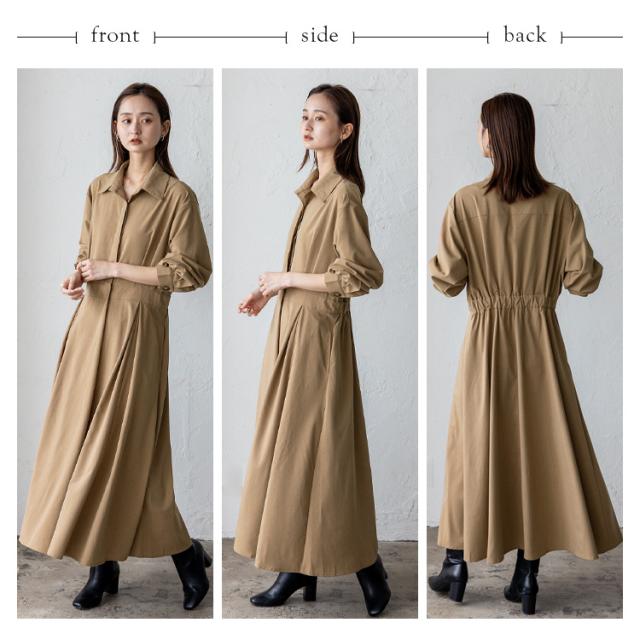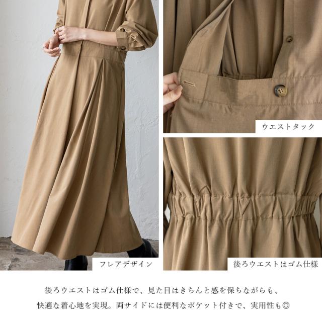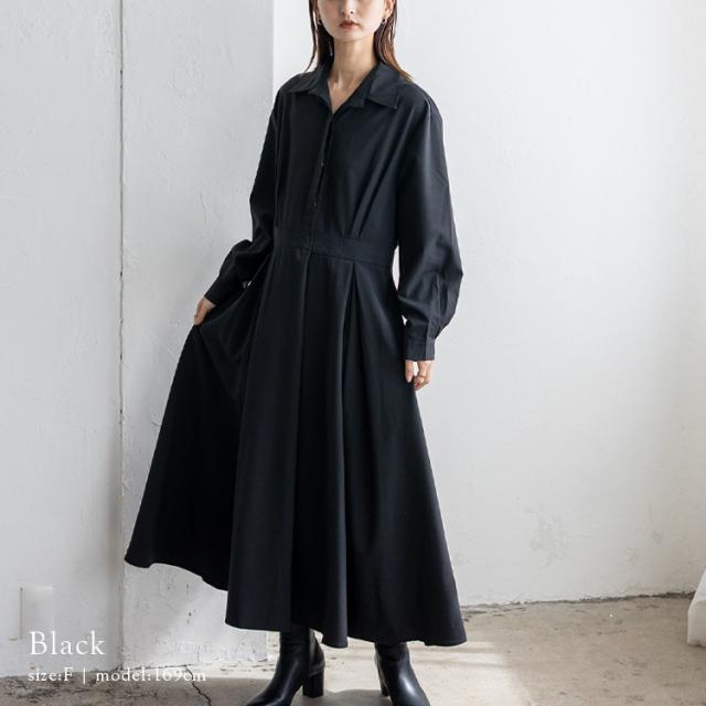 シャツワンピース レディース タック フレアー ワンピース ロング 長袖 シャツワンピ ロングワンピース 黒 きれいめ 膝下 大きいサイズ カジュアル おしゃれ フリーサイズ ゆったり 体型カバー 二の腕カバー 可愛い【メール便】 nrc-0020 【No Rule No Line】