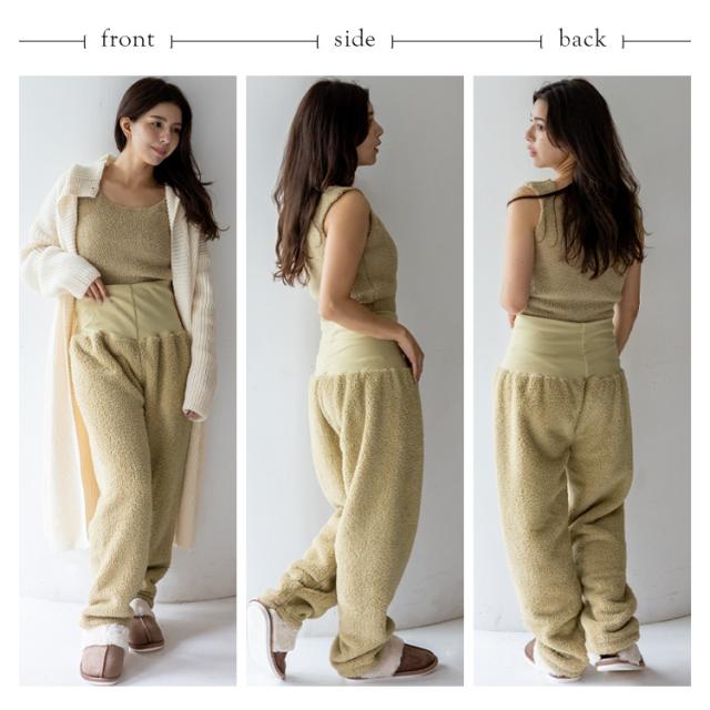 裾に向かって自然に細くなるシルエットで、足元も暖かくキープ。お風呂上がりやリラックスタイムにもぴったりな、あたたかルームウェアです。