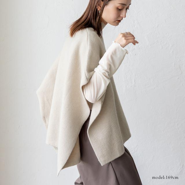留めて袖のように着ても、外してポンチョ風にゆったり羽織っても◎。