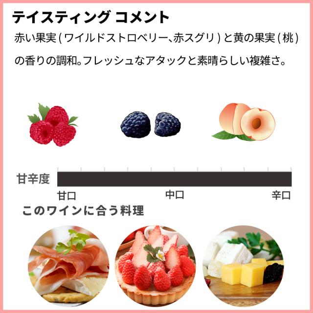 ![]() ■ぶどう品種:ピノ・ムニエ 75%、ピノ・ノワール 20%、シャルドネ 5% ■発酵・熟成:オーク樽で1年間熟成 ■平均樹齢:25年 ■土壌:粘土石灰質土壌 ■ドサージュ:8 g/L 外観:サーモン色のニュアンスを帯びたチェリーレッドの色合い。香り:赤い果実(ワイルドストロベリー、赤スグリ)と黄の果実(桃)の香りの調和。味わい:フレッシュなアタックと素晴らしい複雑さ。赤い果実:ラズベリー、ブラックベリー、スグリ。ペアリング:このキュヴェは、アペリティフ、デザート(ストロベリータルト)、チーズと一緒に供することができます。 チェリーやカシスなどの熟した赤い果実のアロマたっぷりの繊細で芳醇な味わいのゴージャスな辛口・ロゼ・シャンパーニュが、もちろん輸出されるまでドメーヌのセラーでゆっくり熟成!のまさにドメーヌ蔵出し作品で、しかも現地のセラー数ヶ月前の蔵出し品で限定少量入荷! |