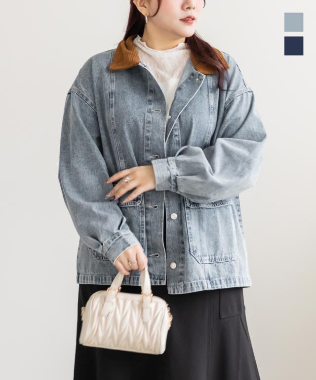 | 3Lサイズを着用してちょうどいいサイズ感でした。少し長めの丈感でアウターとしてちょうどいいバランスで着られました♪カジュアル感のあるGジャンで、衿がコーデュロイ生地なのが可愛い◎キレイめなスラックスや甘めのスカートと合わせたミックスコーデがおすすめです!定番で持っておきたいアイテムで春秋のアウターとして活躍します! |