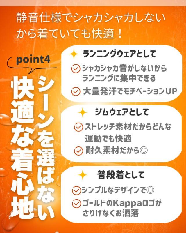 ジムウェアやフィットネス、ランニング、ボクシングをはじめ格闘技など幅広いシーンで活躍。