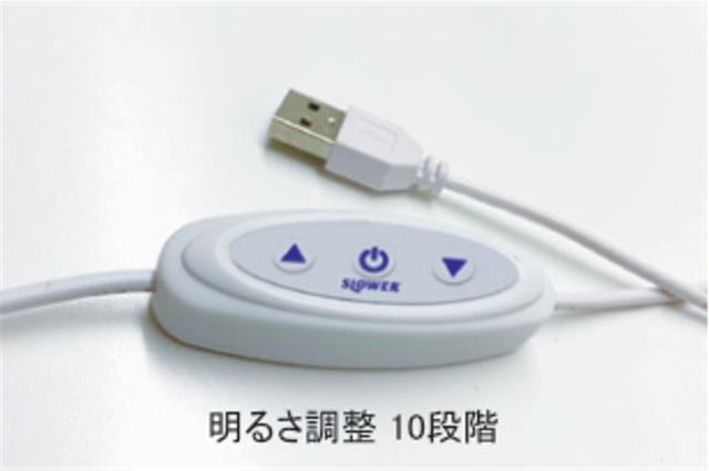 ON/OFFスイッチには調光ボタンがついており、10段階のお好みの明るさでご使用いただけます。電源はUSB接続となります。
