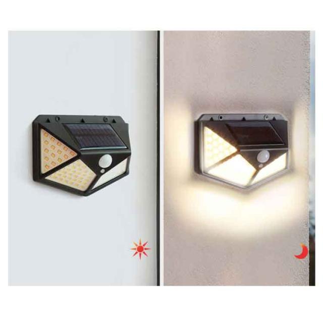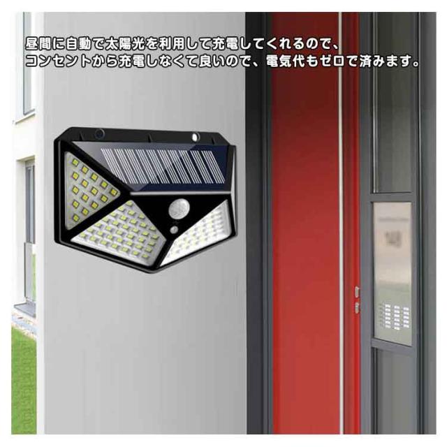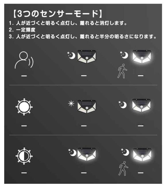 | ソーラーライト 【3つのセンサーモード】 1. 人が近づくと明るく点灯し、離れると消灯します。 2. 一定輝度 3. 人が近づくと明るく点灯し、離れると半分の明るさになります。 約50平方メートルの範囲を照らします。 ソーラーライトは太陽光エネルギーを電源としています。昼間に自動で太陽光を利用して充電してくれるので、コンセントから充電しなくて良いので、電気代もゼロで済みます。 | |
