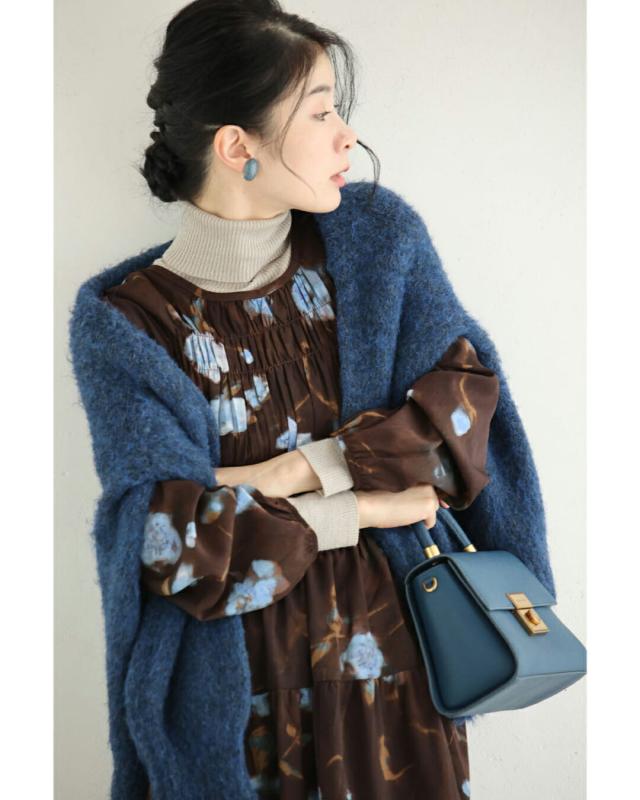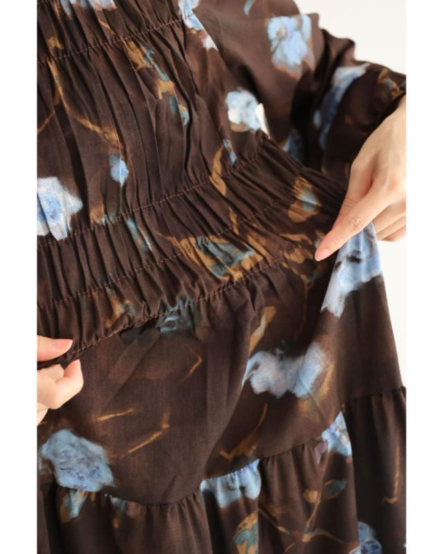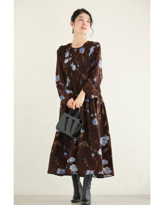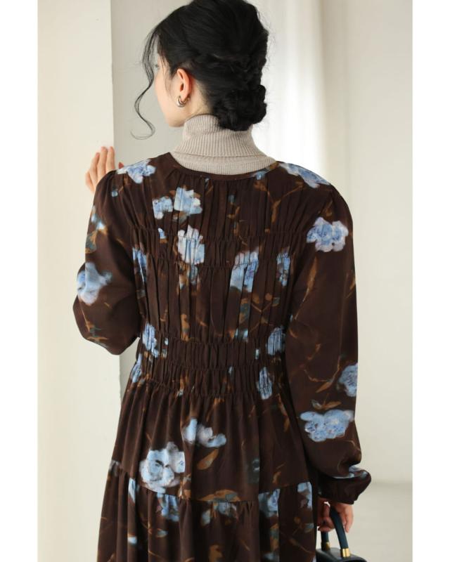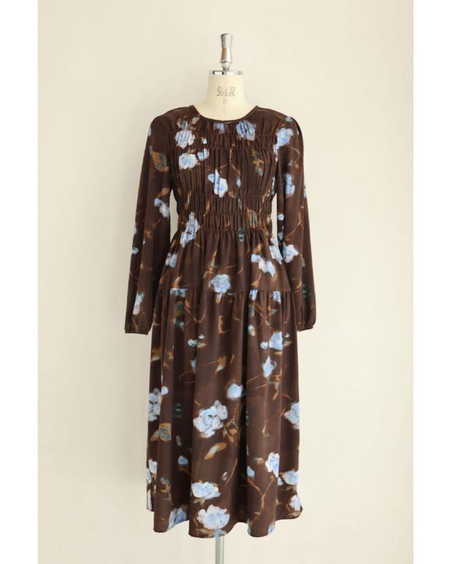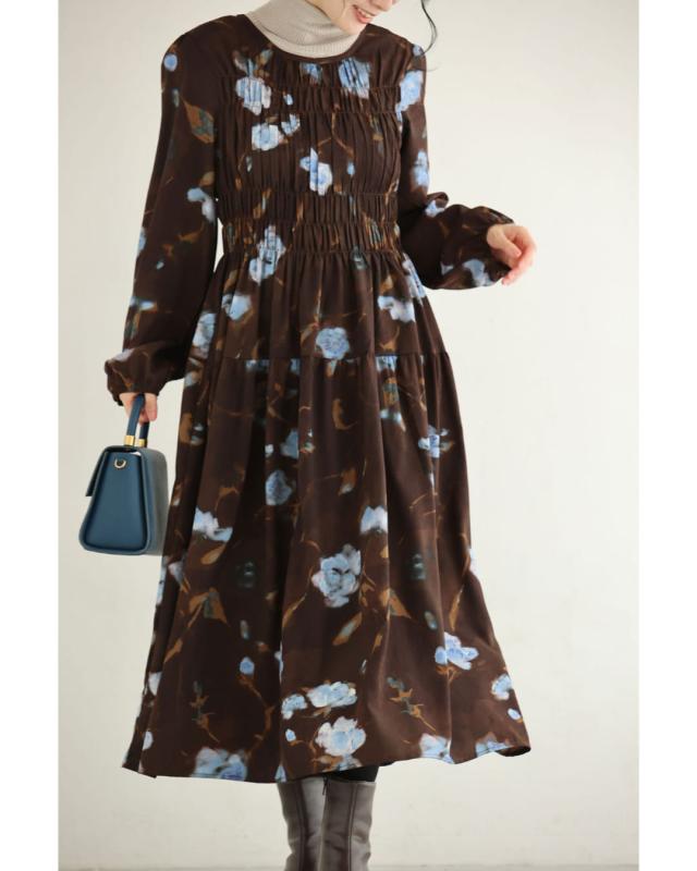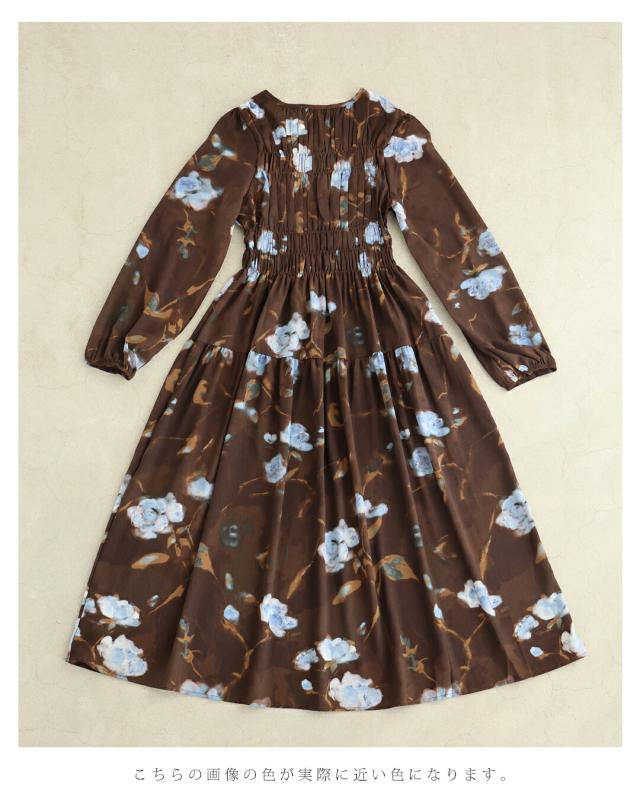 wkj00304 新作 新着 再入荷 CAWAII FRENCHPAVE フレンチパヴェ エレガント ベーシック カジュアル 可愛い かわいい カワイイ おしゃれ オシャレ お洒落 個性 個性的 定番 ベーシック 大人かわいい 大人可愛い 上品 女性らしい デザイン スタンダード ナチュラル きれいめ キレイめ シンプル フェミニン レディース レディースファッション 大人 ママ ミセス 30代 40代 50代 60代 淡いブルーの花が降る胸元シャーリングミディアムワンピース 長袖 S M L ワンサイズ フリー 小さめ 小さい 低身長 痩せ ほっそり 小柄 細身 標準サイズ 大きめシルエット 大きい ビッグシルエット ゆったり F サイズ自由 春 秋 冬 秋服 秋物 冬服 冬物 体型カバー ブラウン 茶 柄 総柄 花 フラワー柄 普段着 日常使い デイリー使い おでかけ 女子会 買い物 デート ティアード シャーリング