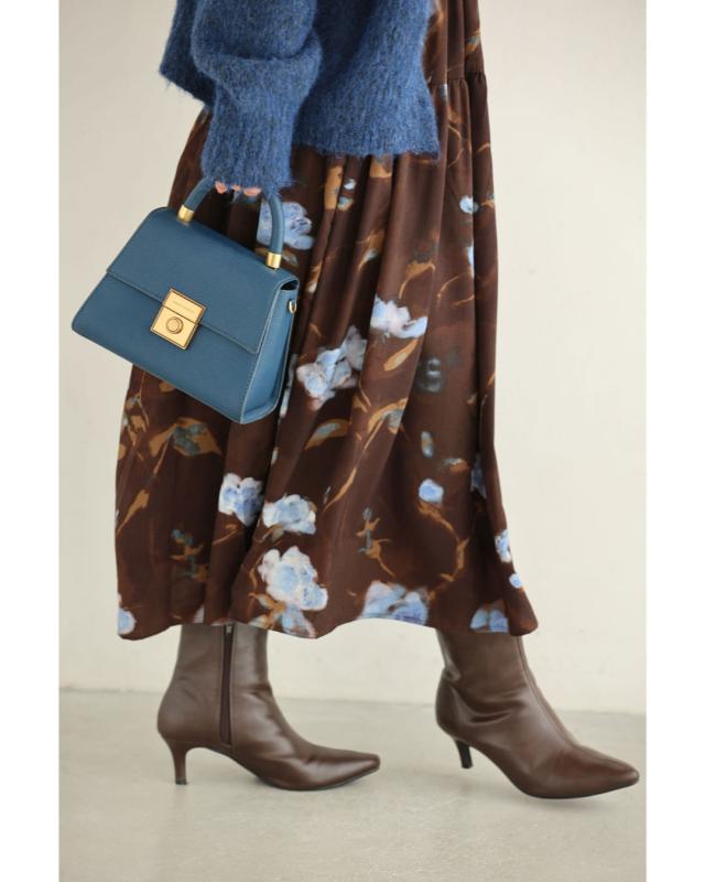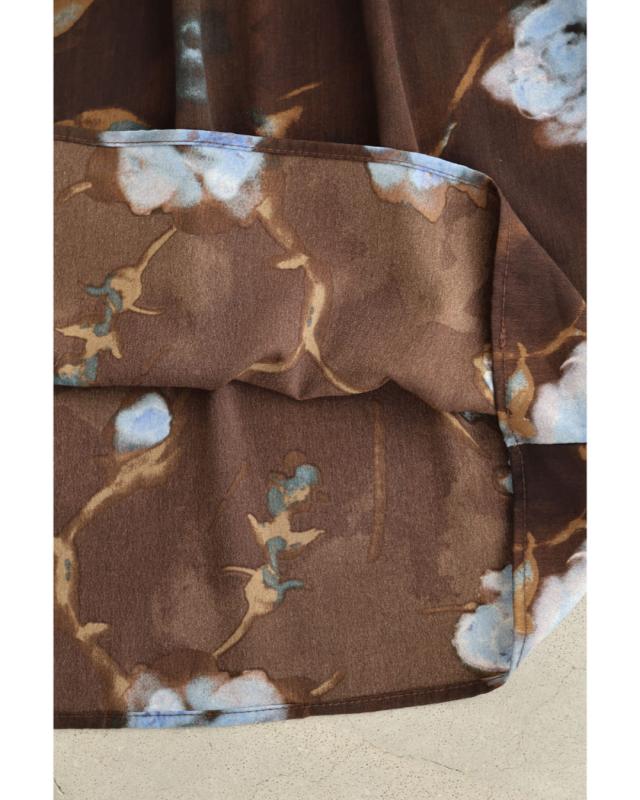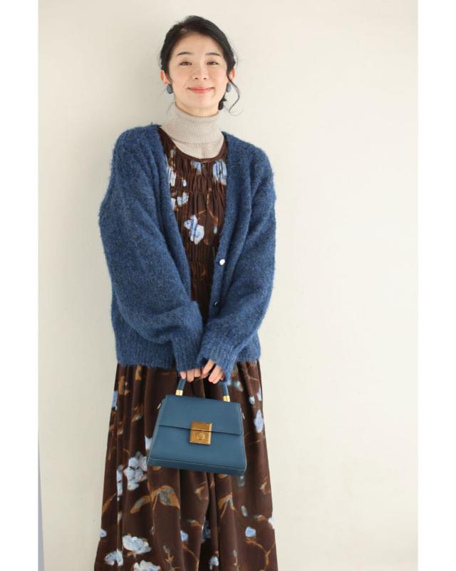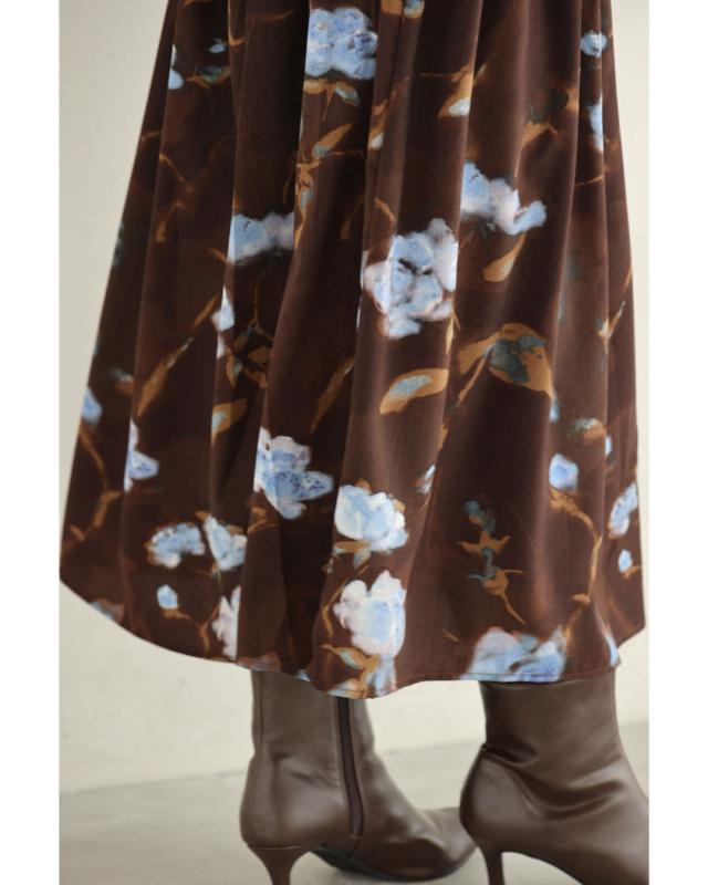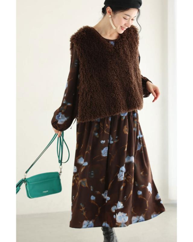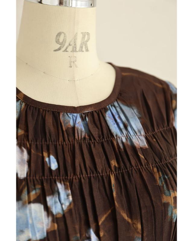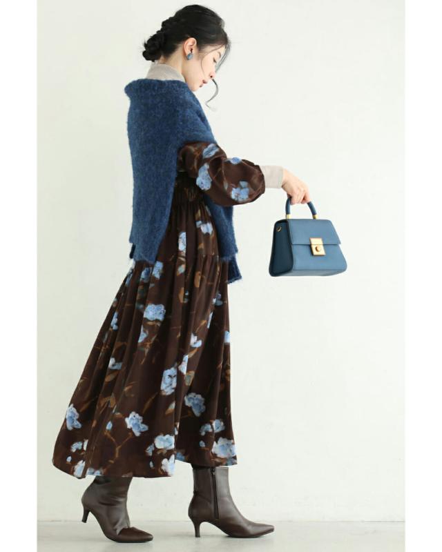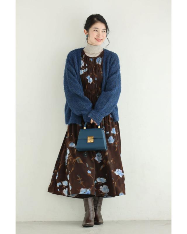 wkj00304 新作 新着 再入荷 CAWAII FRENCHPAVE フレンチパヴェ エレガント ベーシック カジュアル 可愛い かわいい カワイイ おしゃれ オシャレ お洒落 個性 個性的 定番 ベーシック 大人かわいい 大人可愛い 上品 女性らしい デザイン スタンダード ナチュラル きれいめ キレイめ シンプル フェミニン レディース レディースファッション 大人 ママ ミセス 30代 40代 50代 60代 淡いブルーの花が降る胸元シャーリングミディアムワンピース 長袖 S M L ワンサイズ フリー 小さめ 小さい 低身長 痩せ ほっそり 小柄 細身 標準サイズ 大きめシルエット 大きい ビッグシルエット ゆったり F サイズ自由 春 秋 冬 秋服 秋物 冬服 冬物 体型カバー ブラウン 茶 柄 総柄 花 フラワー柄 普段着 日常使い デイリー使い おでかけ 女子会 買い物 デート ティアード シャーリング