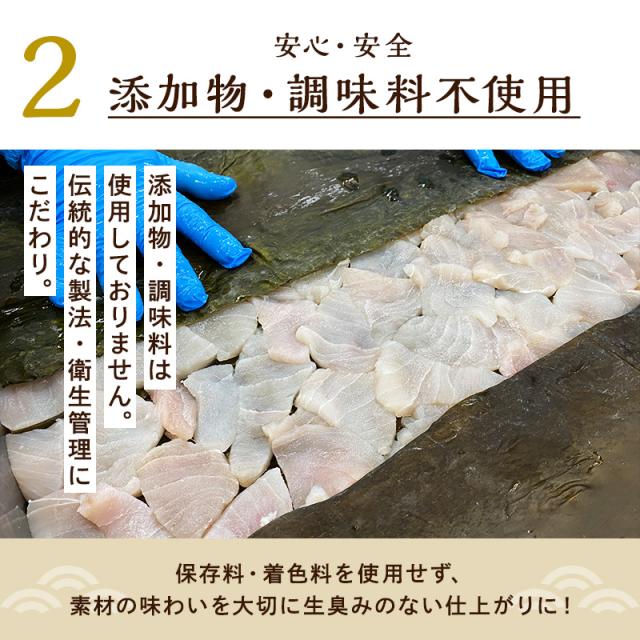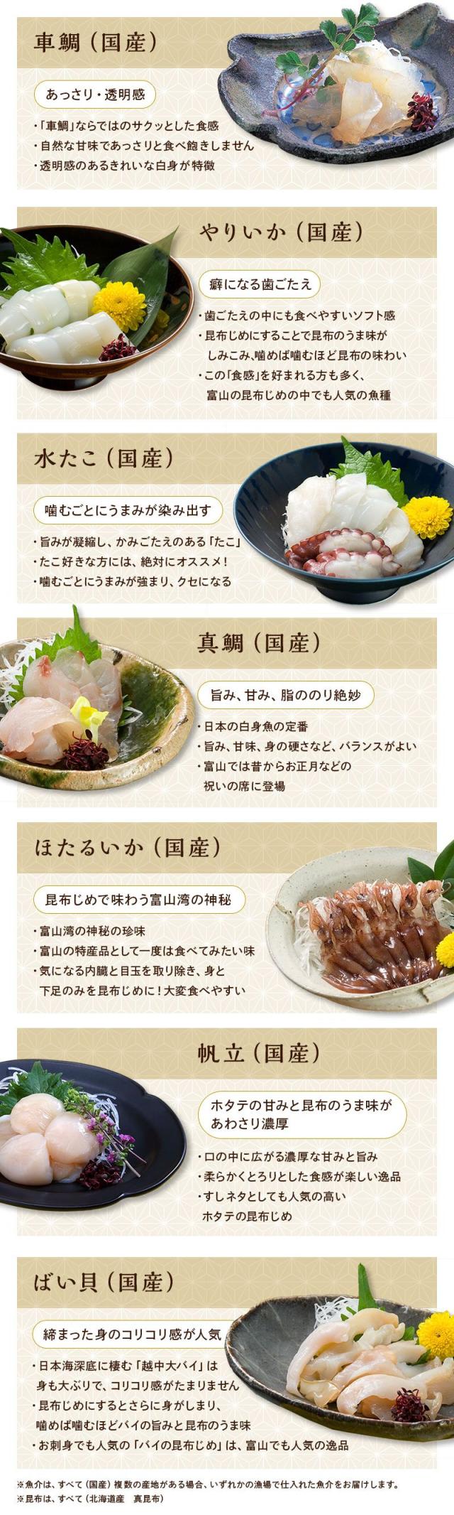 原材料:真かじき(国産)、帆立(国産)、蛍烏賊(国産)、ひらめ(国産)、ばい貝(国産)、やりいか(国産)、真鯛(国産)、水蛸(国産)、車鯛(国産)、昆布(国産)(一部にいかを含む)