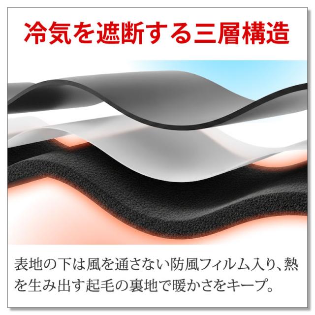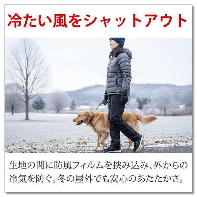 表地の下に冷気を通さない防風フィルムを挟み、裏地には汗や湿気を吸収して熱に変える吸湿発熱素材を採用。
