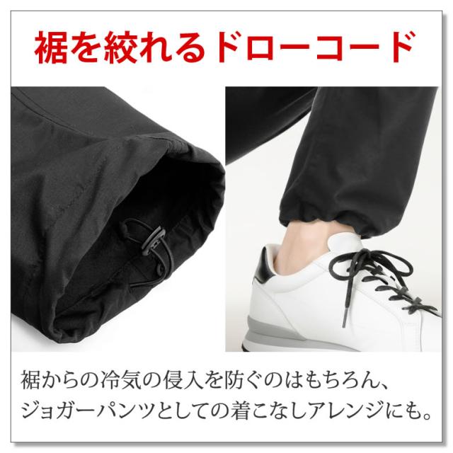 裾にはドローコードを備え、冷気の侵入を防ぎながらシルエットアレンジも楽しめる。