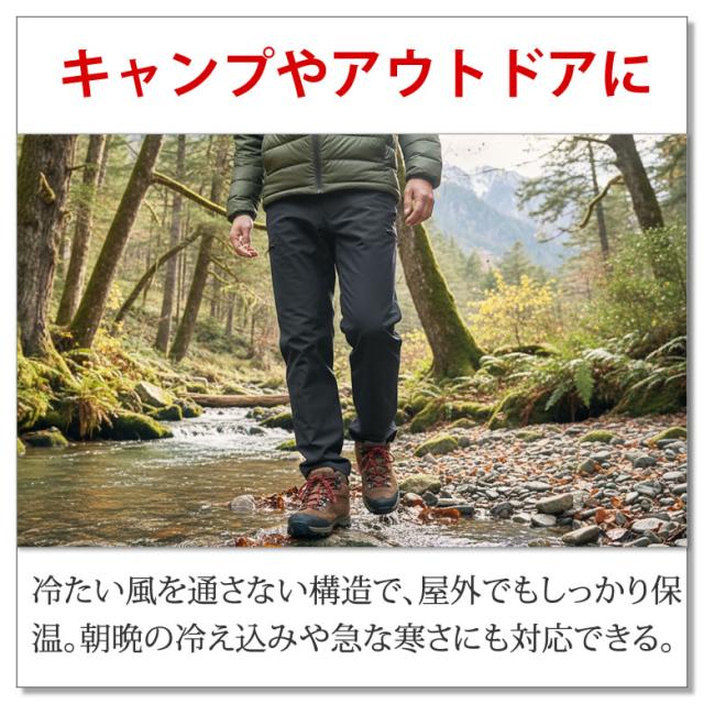 | アウトドアブランドのラドウェザー から三層構造の防寒パンツが登場。 表地の下に冷気を通さない防風フィルムを挟み、裏地には汗や湿気を吸収して熱に変える吸湿発熱素材を採用。 着ているうちに自然とぽかぽか温まり、真冬の屋外でも頼れるあたたかさ。 さらに内側はふんわりとした裏起毛で、履いた瞬間からぬくもりを実感。 ウエストはゴム仕様+内側の紐で調整自在。 裾にはドローコードを備え、冷気の侵入を防ぎながらシルエットアレンジも楽しめる。 さらに、ファスナー付きポケットやフラップポケットなど計6つのポケットで機能性も抜群。 防風構造と高い保温性で、キャンプ・釣り・自転車・ウォーキングなどのアウトドアにも最適。 シンプルなデザインだからルームウェアとしても使え、年齢や性別を問わず着こなしやすい万能アイテム。 寒さに負けない快適さを、あなたの毎日に。 ■冷気を遮断する三層構造 表地の下は風を通さない防風フィルム入り、熱を生み出す起毛の裏地で暖かさをキープ。 ■吸湿発熱で自然にあったか 裏地に汗や湿気を吸収して熱に変える素材を使用。着ているちに暖かさを感じられる。 ■冷たい風をシャットアウト 生地の間に防風フィルムを挟み込み、外からの冷気を防ぐ。冬の屋外でも安心のあたたかさ。 ■ふんわり暖か裏起毛 内側は肌触りが柔らかく優しい裏起毛。履いた瞬間から暖かく、しっかり保温する。 ■着こなしやすいデザイン シンプルなデザインで年齢や性別を問わず着ることができる。 ■ウエストが調整しやすい ウエストはゴム仕様でフィット感がよく、内側の紐でサイズ調節もラクラク。快適に過ごせる。 ■裾を絞れるドローコード 裾からの冷気の侵入を防ぐのはもちろん、ジョガーパンツとしての着こなしアレンジにも。 ■小物収納に便利なポケット ポケットは計6個。ヒップにはフラップ、両サイドにはファスナー付きでお出かけにも活躍。 ■キャンプやアウトドアに 冷たい風を通さない構造で、屋外でもしっかり保温。朝晩の冷え込みや急な寒さにも対応できる。 ■釣りに 水辺でも体温を逃さずキープ。裏起毛のぬくもりで、足元から冷えを感じにくく快適に過ごせる。 ■自転車やバイクに 走行中の冷たい風を防ぐ防風フィルム、裏起毛で内側はあったか。通勤・通学・ツーリングにも。 ■ウォーキングに 吸湿発熱素材が、歩くたびにじんわりあたたかさをプラス。軽い着心地で動きを妨げない。 ■ルームウェアに 裏起毛のやわらかさがリラックスタイムにぴったり。ウエストはゴム仕様で締めつけ感がない。 | |