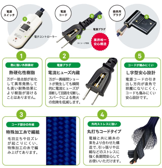 こたつのプロがとことん考え抜いた、安心構造のこたつコードです。