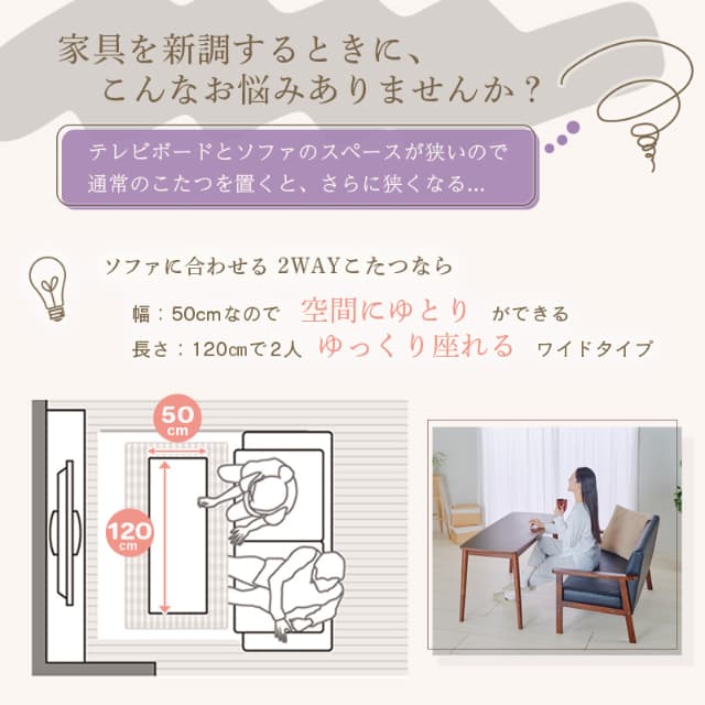 ユアサプライムス こたつテーブル 人感センサー付き ソファに合わせる 2Way コタツテーブル AYK-SKM120C2 ハイタイプ ロータイプ 長方形 120×50cm 継脚20cm YUASA