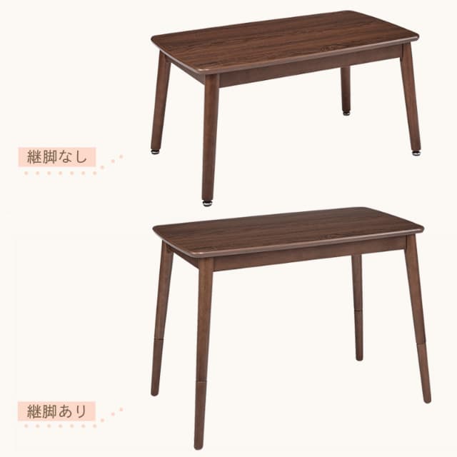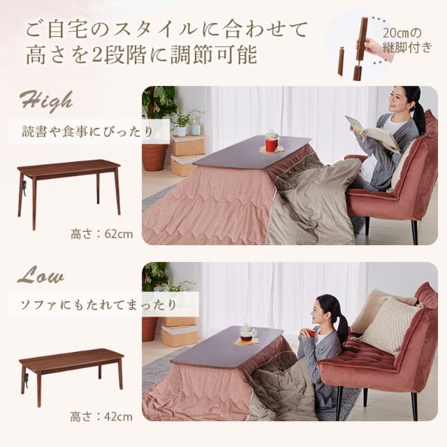 ・継脚付きでこたつの高さを42cm/62cmの2段階に調節可。