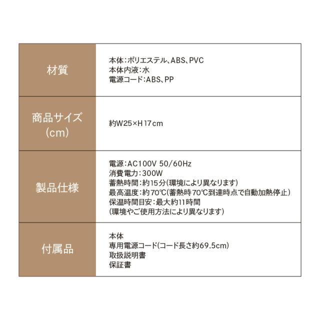 仕様 | 電源:AC100V 50/60Hz 消費電力:300W 蓄電時間:約15分(環境により異なります) 最高温度:約70℃(蓄熱時70℃で到達時点で自動過熱停止) 保温時間目安:最大約11時間(室温25度であんかとして布団などでくるんで使用した場合/環境やご使用方法により異なります) |